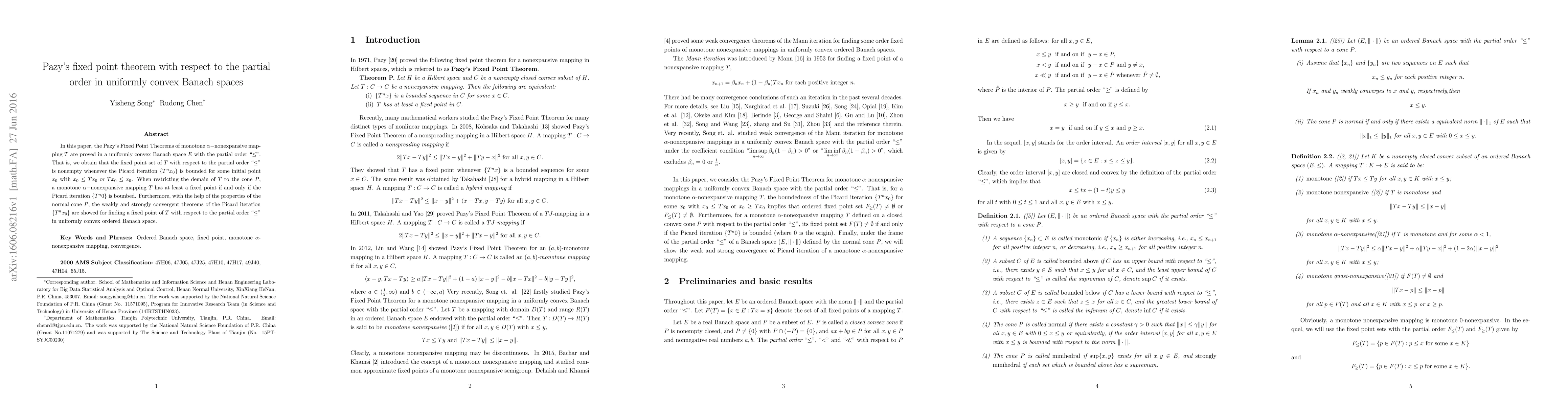 The paper proves Pazy's Fixed Point Theorem in uniformly convex Banach spaces with a partial order, showing that a monotone $eta$-nonexpansive mapping has a fixed point if the Picard iteration is bounded.