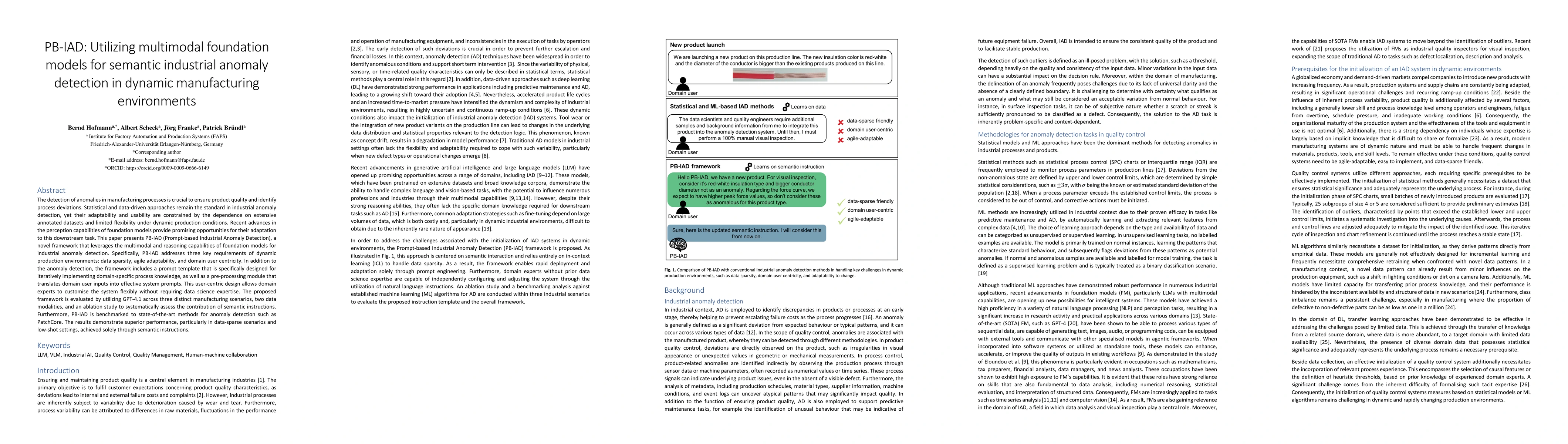 The paper presents PB-IAD, a framework for industrial anomaly detection using multimodal foundation models, focusing on data sparsity, agile adaptability, and domain user centricity. It employs GPT-4.1 for anomaly detection and a custom prompt pre-processor, GPT-4o, for translating user inputs into system prompts.