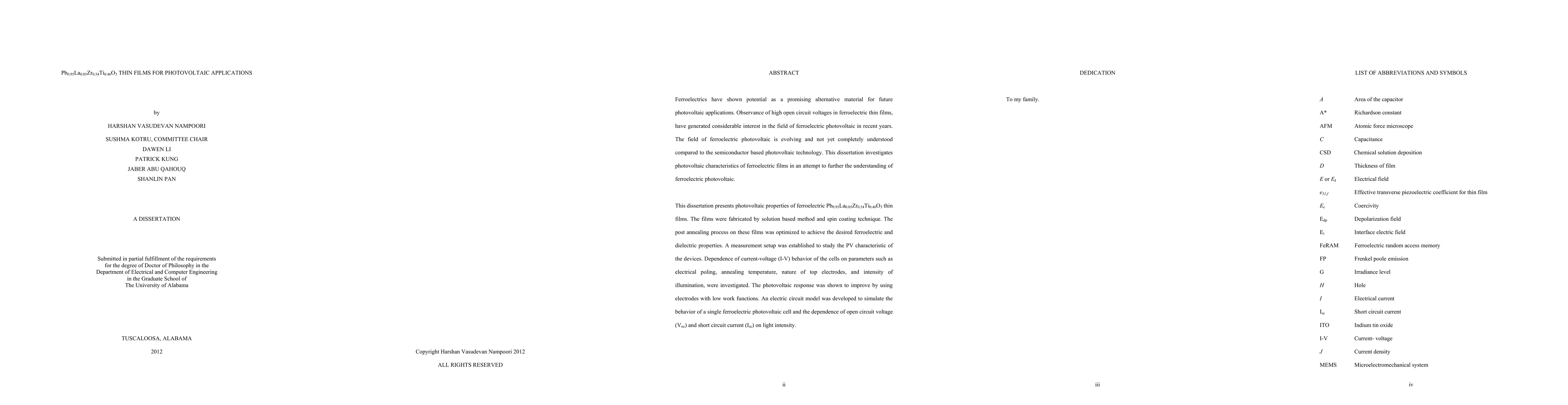 Ferroelectrics have shown potential as a promising alternative material for future photovoltaic applications. Observance of high open circuit voltages in ferroelectric thin films, have generated considerable interest in the field of ferroelectric photovoltaic in recent years. The field of ferroelectric photovoltaic is evolving and not yet completely understood compared to the semiconductor based photovoltaic technology. This dissertation investigates photovoltaic characteristics of ferroelectric films in an attempt to further the understanding of ferroelectric photovoltaic. This dissertation presents photovoltaic properties of ferroelectric Pb0.95La0.05Zr0.54Ti0.46O3 thin films. The films were fabricated by solution based method and spin coating technique. The post annealing process on these films was optimized to achieve the desired ferroelectric and dielectric properties. A measurement setup was established to study the PV characteristic of the devices. Dependence of current-voltage (I-V) behavior of the cells on parameters such as electrical poling, annealing temperature, nature of top electrodes, and intensity of illumination, were investigated. The photovoltaic response was shown to improve by using electrodes with low work functions. An electric circuit model was developed to simulate the behavior of a single ferroelectric photovoltaic cell and the dependence of open circuit voltage (Voc) and short circuit current (Isc) on light intensity.