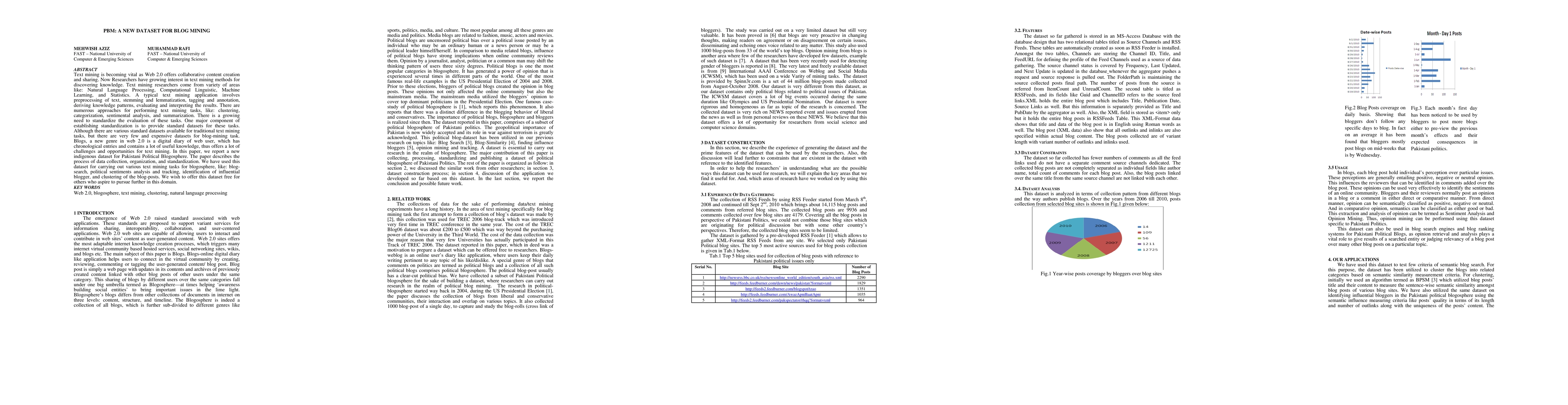 This paper introduces a new dataset for Pakistani Political Blogosphere aimed at facilitating blog mining research. The authors describe the data collection, organization, and standardization process, and demonstrate its use in tasks like blog search, political sentiment analysis, influential blogger identification, and blog-post clustering.