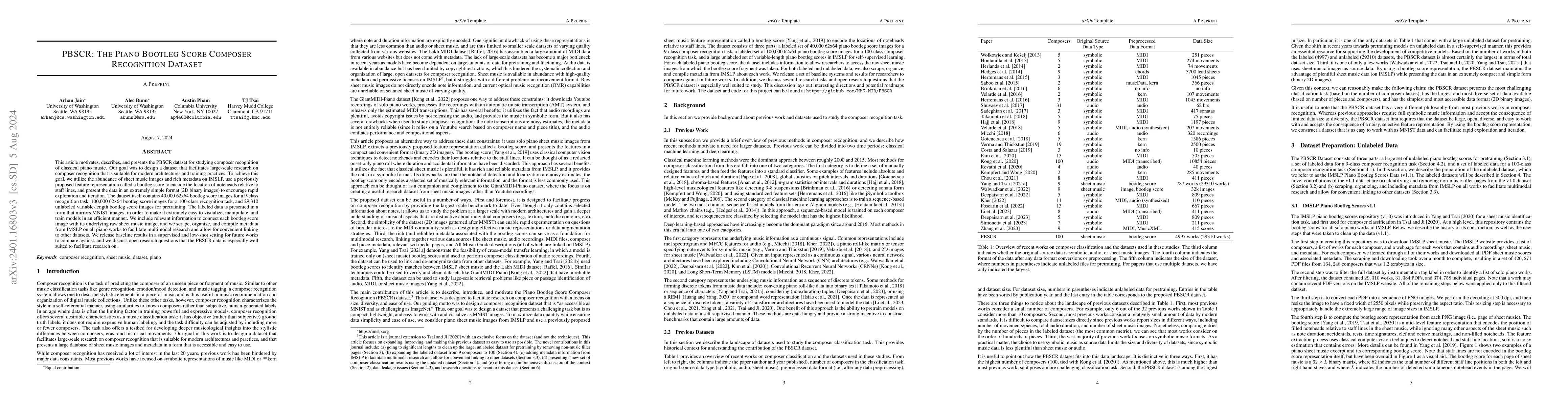 The PBSCSR dataset aims to facilitate composer style recognition research using piano sheet music, offering 40,000 and 100,000 fixed-length bootleg score images for 9-way and 100-way classification tasks, respectively. The dataset is designed to be as accessible as MNIST but as challenging as ImageNet, with additional metadata for raw sheet music access.