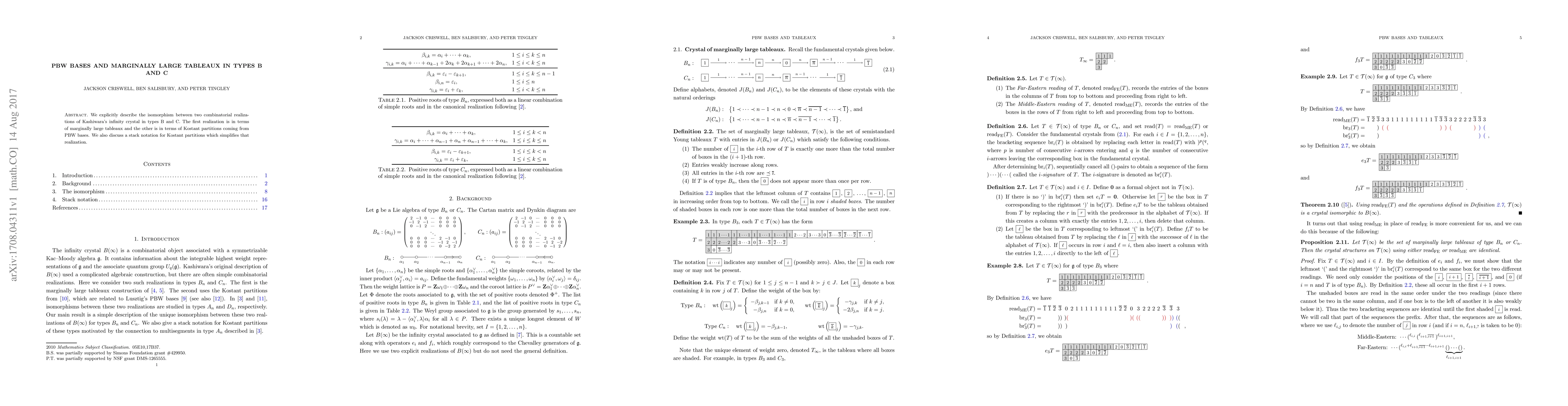 This paper establishes an isomorphism between two combinatorial realizations of Kashiwara's infinity crystal in types B and C, using marginally large tableaux and PBW bases, with a simplified stack notation for Kostant partitions.