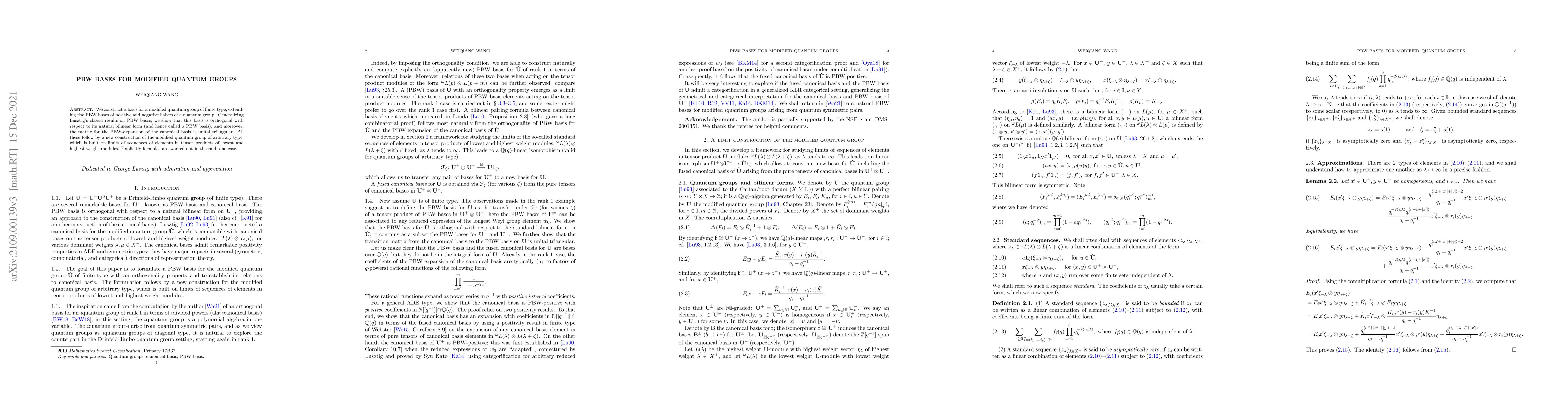 We construct a basis for a modified quantum group of finite type, extending the PBW bases of positive and negative halves of a quantum group. Generalizing Lusztig's classic results on PBW bases, we show that this basis is orthogonal with respect to its natural bilinear form (and hence called a PBW basis), and moreover, the matrix for the PBW-expansion of the canonical basis is unital triangular. All these follow by a new construction of the modified quantum group of arbitrary type, which is built on limits of sequences of elements in tensor products of lowest and highest weight modules. Explicitly formulas are worked out in the rank one case.