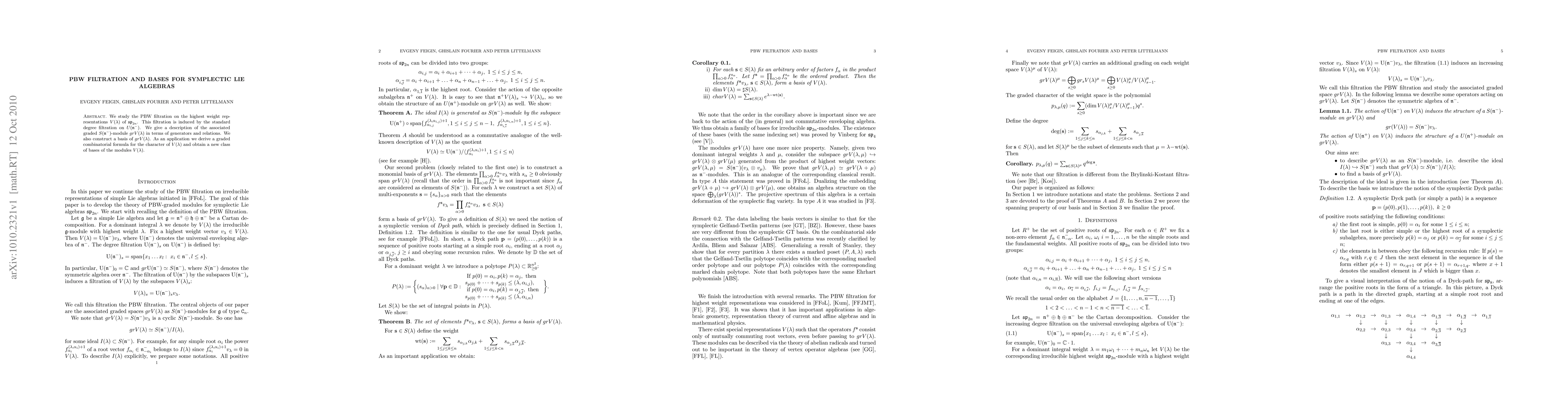 Researchers studied the PBW filtration on highest weight representations of the symplectic Lie algebra, deriving a basis and a graded combinatorial formula for the character of these modules.