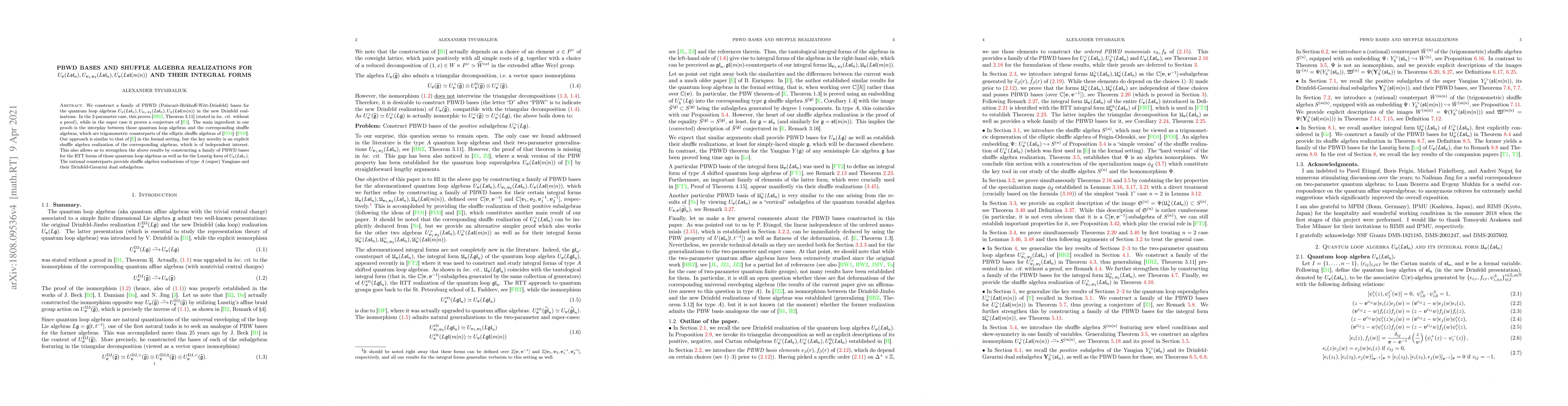 We construct a family of PBWD (Poincar\'e-Birkhoff-Witt-Drinfeld) bases for the quantum loop algebras $U_v(L\mathfrak{sl}_n), U_{v_1,v_2}(L\mathfrak{sl}_n), U_v(L\mathfrak{sl}(m|n))$ in the new Drinfeld realizations. In the 2-parameter case, this proves Theorem 3.11 of [Hu-Rosso-Zhang] (stated in loc. cit. without a proof), while in the super case it proves a conjecture of [Zhang]. The main ingredient in our proofs is the interplay between those quantum loop algebras and the corresponding shuffle algebras, which are trigonometric counterparts of the elliptic shuffle algebras of Feigin-Odesskii. Our approach is similar to that of [Enriquez] in the formal setting, but the key novelty is an explicit shuffle algebra realization of the corresponding algebras, which is of independent interest. This also allows us to strengthen the above results by constructing a family of PBWD bases for the RTT forms of those quantum loop algebras as well as for the Lusztig form of $U_v(L\mathfrak{sl}_n)$. The rational counterparts provide shuffle algebra realizations of the type $A$ (super) Yangians and their Drinfeld-Gavarini dual subalgebras.