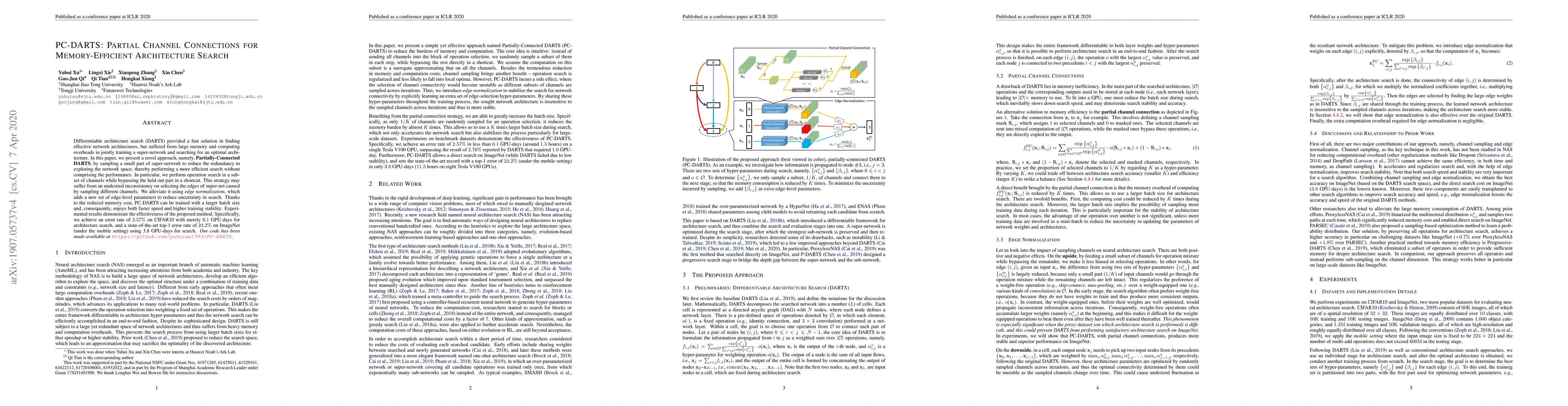 Differentiable architecture search (DARTS) provided a fast solution in finding effective network architectures, but suffered from large memory and computing overheads in jointly training a super-network and searching for an optimal architecture. In this paper, we present a novel approach, namely, Partially-Connected DARTS, by sampling a small part of super-network to reduce the redundancy in exploring the network space, thereby performing a more efficient search without comprising the performance. In particular, we perform operation search in a subset of channels while bypassing the held out part in a shortcut. This strategy may suffer from an undesired inconsistency on selecting the edges of super-net caused by sampling different channels. We alleviate it using edge normalization, which adds a new set of edge-level parameters to reduce uncertainty in search. Thanks to the reduced memory cost, PC-DARTS can be trained with a larger batch size and, consequently, enjoys both faster speed and higher training stability. Experimental results demonstrate the effectiveness of the proposed method. Specifically, we achieve an error rate of 2.57% on CIFAR10 with merely 0.1 GPU-days for architecture search, and a state-of-the-art top-1 error rate of 24.2% on ImageNet (under the mobile setting) using 3.8 GPU-days for search. Our code has been made available at: https://github.com/yuhuixu1993/PC-DARTS.