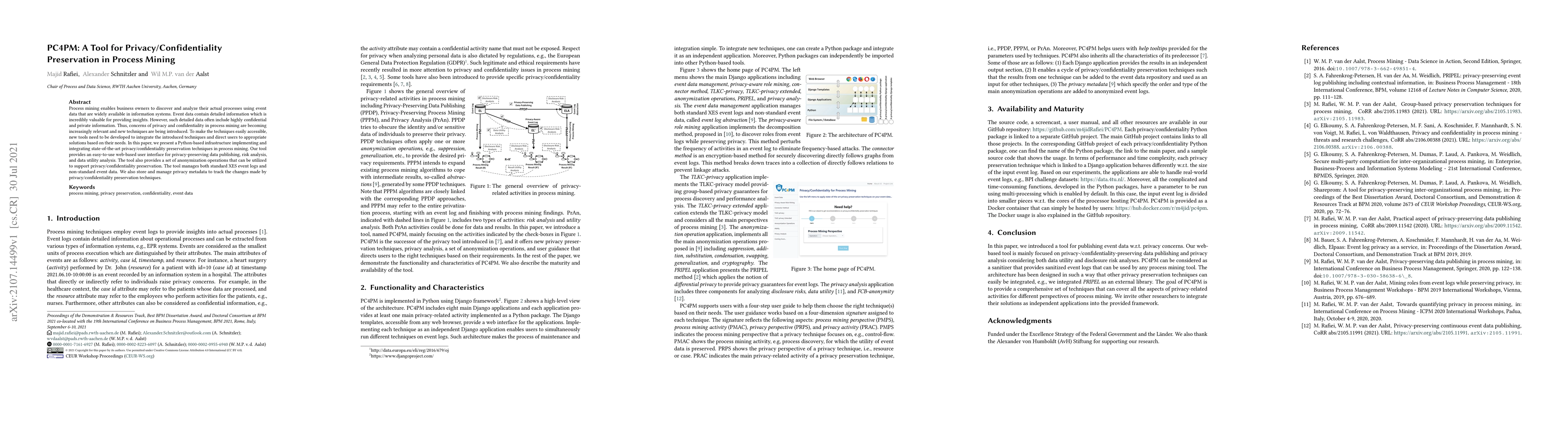 The paper introduces PC4PM, a Python-based tool for privacy/confidentiality preservation in process mining, featuring a web-based interface for data publishing, risk analysis, and anonymization operations to handle both standard and non-standard event data, along with privacy metadata management.