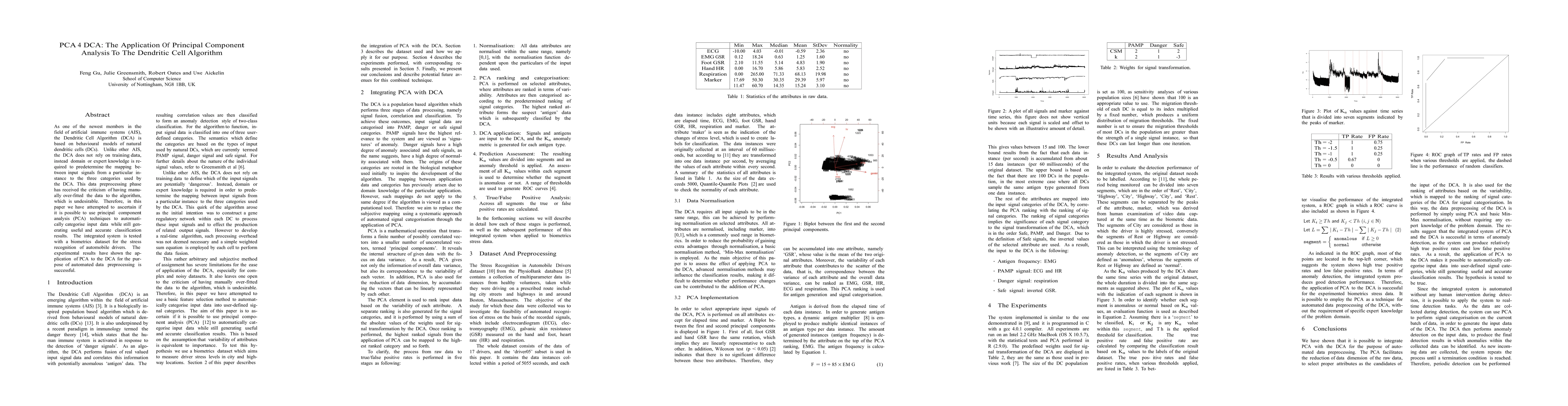 As one of the newest members in the field of artificial immune systems (AIS), the Dendritic Cell Algorithm (DCA) is based on behavioural models of natural dendritic cells (DCs). Unlike other AIS, the DCA does not rely on training data, instead domain or expert knowledge is required to predetermine the mapping between input signals from a particular instance to the three categories used by the DCA. This data preprocessing phase has received the criticism of having manually over-?tted the data to the algorithm, which is undesirable. Therefore, in this paper we have attempted to ascertain if it is possible to use principal component analysis (PCA) techniques to automatically categorise input data while still generating useful and accurate classication results. The integrated system is tested with a biometrics dataset for the stress recognition of automobile drivers. The experimental results have shown the application of PCA to the DCA for the purpose of automated data preprocessing is successful.