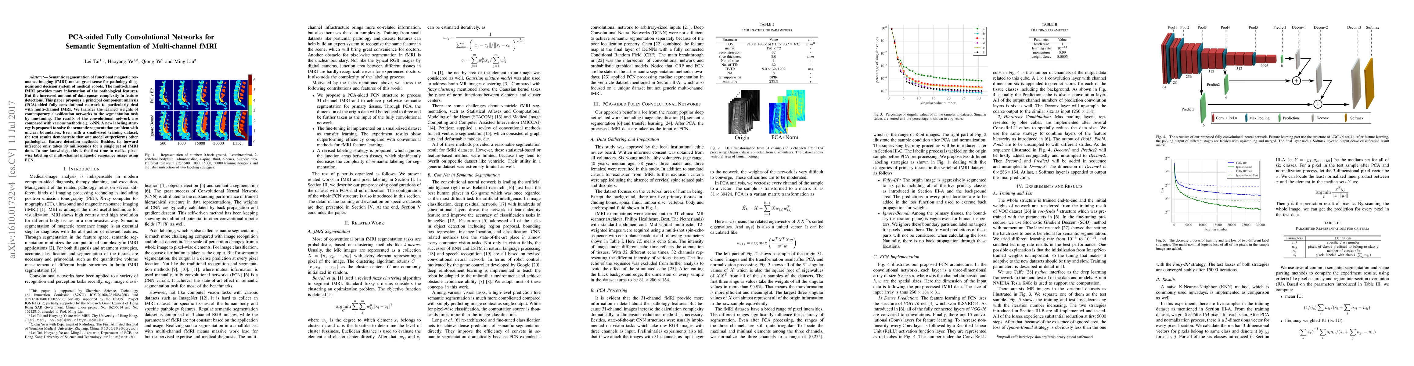 This paper introduces a PCA-aided fully convolutional network for semantic segmentation of multi-channel fMRI, achieving superior pathological feature detection compared to other methods. The approach leverages fine-tuned weights from classification networks and a new labeling strategy, demonstrating fast inference times and effective segmentation even with limited training data.