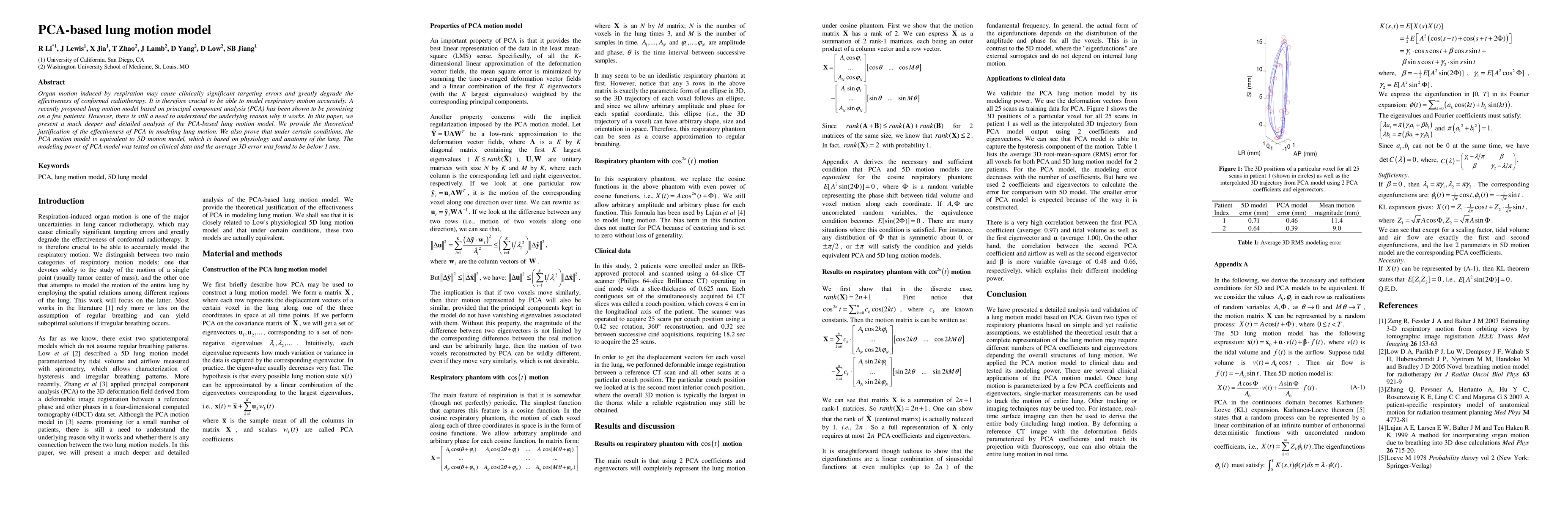 Organ motion induced by respiration may cause clinically significant targeting errors and greatly degrade the effectiveness of conformal radiotherapy. It is therefore crucial to be able to model respiratory motion accurately. A recently proposed lung motion model based on principal component analysis (PCA) has been shown to be promising on a few patients. However, there is still a need to understand the underlying reason why it works. In this paper, we present a much deeper and detailed analysis of the PCA-based lung motion model. We provide the theoretical justification of the effectiveness of PCA in modeling lung motion. We also prove that under certain conditions, the PCA motion model is equivalent to 5D motion model, which is based on physiology and anatomy of the lung. The modeling power of PCA model was tested on clinical data and the average 3D error was found to be below 1 mm.