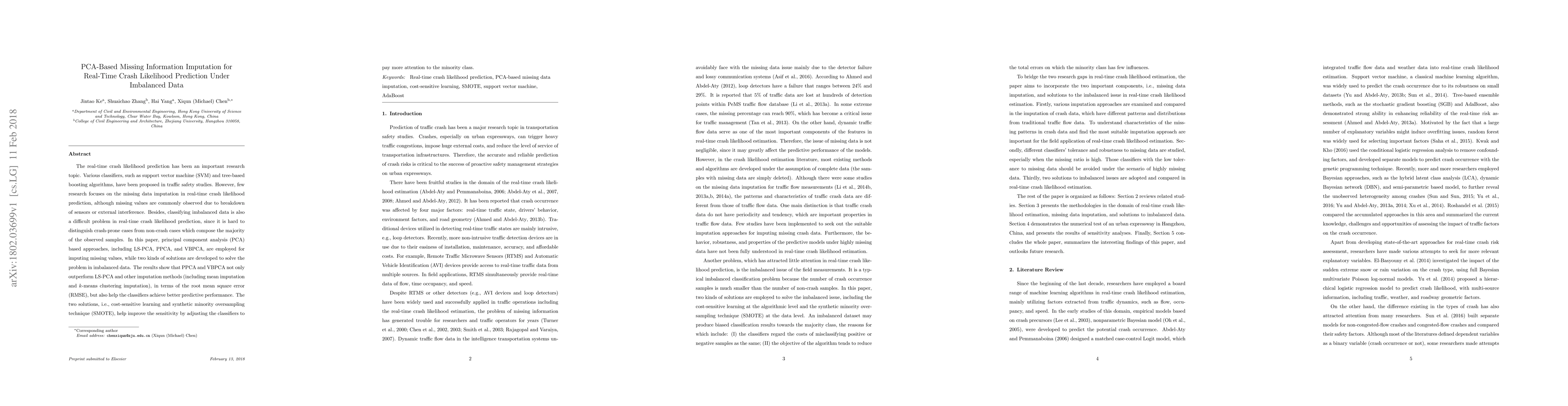 This paper proposes PCA-based methods for missing data imputation to improve real-time crash likelihood prediction under imbalanced data conditions. It demonstrates that PPCA and VBPCA outperform other imputation techniques and enhances classifier performance, while cost-sensitive learning and SMOTE improve sensitivity for crash-prone case identification.