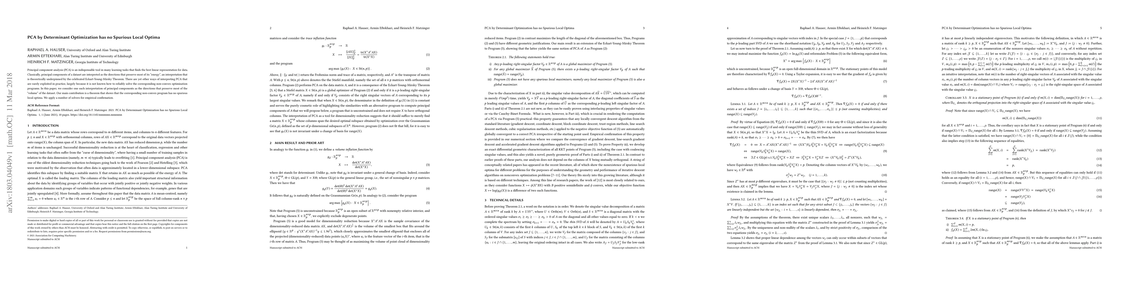 A new theorem proves that a non-convex optimization problem related to Principal Component Analysis (PCA) has no spurious local optima, providing a reliable solution for interpreting PCA as volume-preserving directions.