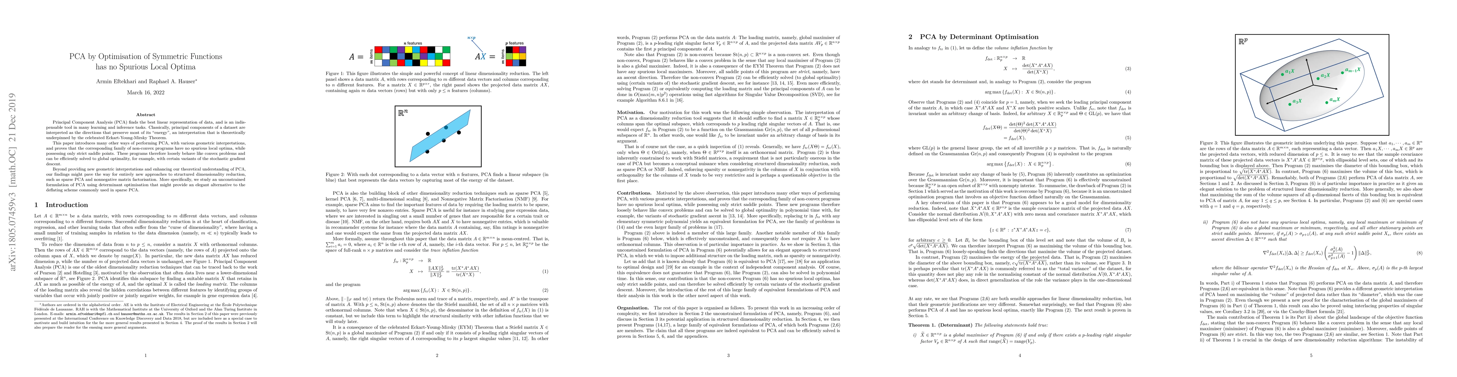 Principal Component Analysis (PCA) finds the best linear representation of data, and is an indispensable tool in many learning and inference tasks. Classically, principal components of a dataset are interpreted as the directions that preserve most of its "energy", an interpretation that is theoretically underpinned by the celebrated Eckart-Young-Mirsky Theorem. This paper introduces many other ways of performing PCA, with various geometric interpretations, and proves that the corresponding family of non-convex programs have no spurious local optima, while possessing only strict saddle points. These programs therefore loosely behave like convex problems and can be efficiently solved to global optimality, for example, with certain variants of the stochastic gradient descent. Beyond providing new geometric interpretations and enhancing our theoretical understanding of PCA, our findings might pave the way for entirely new approaches to structured dimensionality reduction, such as sparse PCA and nonnegative matrix factorisation. More specifically, we study an unconstrained formulation of PCA using determinant optimisation that might provide an elegant alternative to the deflating scheme commonly used in sparse PCA.