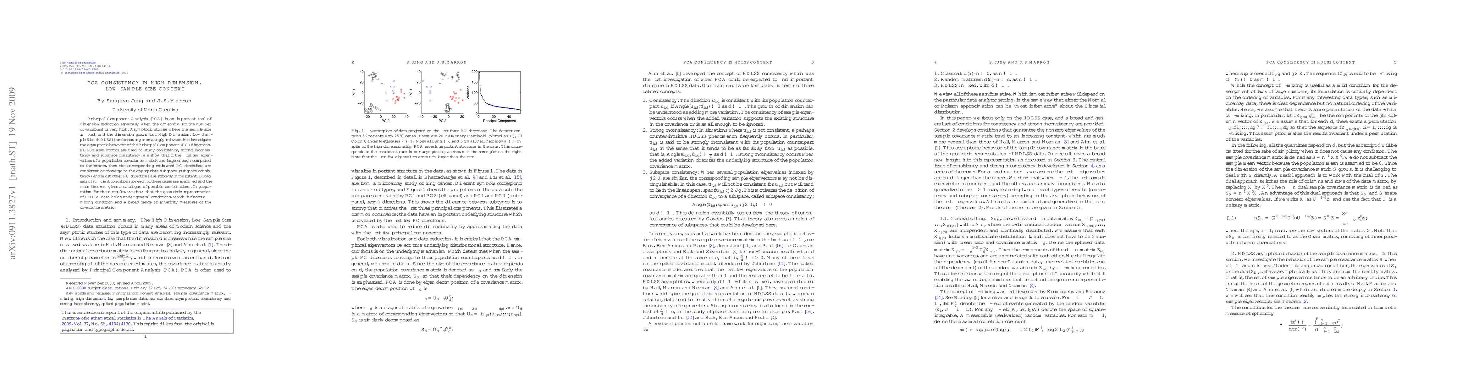 This paper investigates the asymptotic behavior of PCA in high-dimensional, low-sample size contexts, demonstrating that under certain conditions on the population covariance matrix, the first few estimated principal component directions are consistent or exhibit subspace consistency, while others are strongly inconsistent. It provides a comprehensive set of sufficient conditions for these outcomes.
