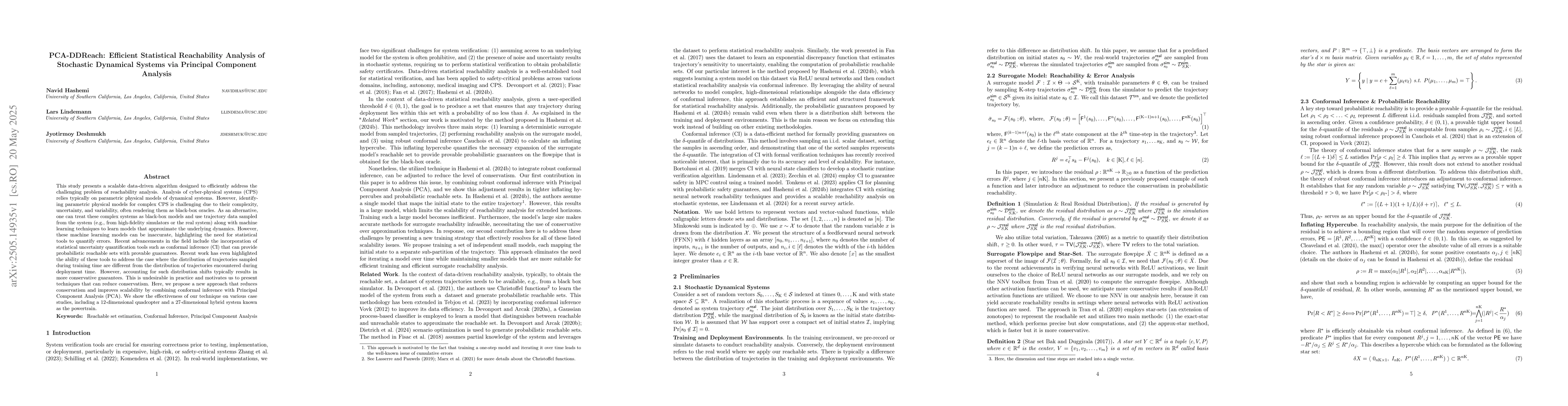 This study presents a new approach to efficiently analyze the reachability of stochastic dynamical systems using Principal Component Analysis (PCA) and conformal inference, reducing conservatism and improving scalability for real-world applications.