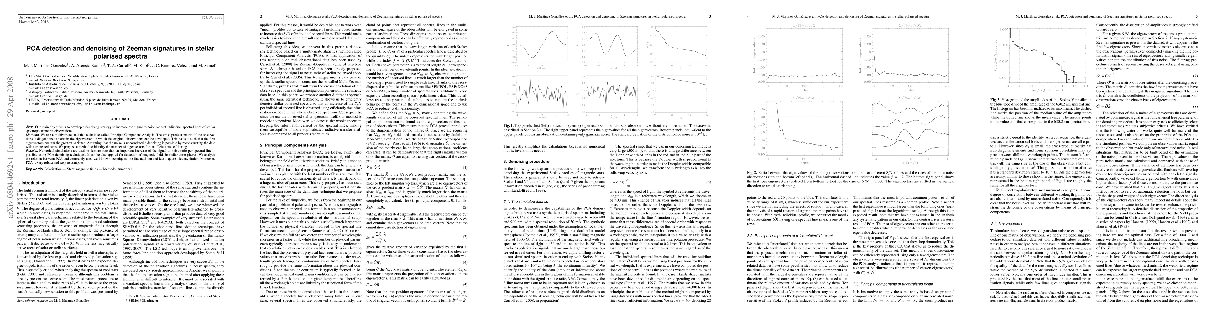 Our main objective is to develop a denoising strategy to increase the signal to noise ratio of individual spectral lines of stellar spectropolarimetric observations. We use a multivariate statistics technique called Principal Component Analysis. The cross-product matrix of the observations is diagonalized to obtain the eigenvectors in which the original observations can be developed. This basis is such that the first eigenvectors contain the greatest variance. Assuming that the noise is uncorrelated a denoising is possible by reconstructing the data with a truncated basis. We propose a method to identify the number of eigenvectors for an efficient noise filtering. Numerical simulations are used to demonstrate that an important increase of the signal to noise ratio per spectral line is possible using PCA denoising techniques. It can be also applied for detection of magnetic fields in stellar atmospheres. We analyze the relation between PCA and commonly used well-known techniques like line addition and least-squares deconvolution. Moreover, PCA is very robust and easy to compute.