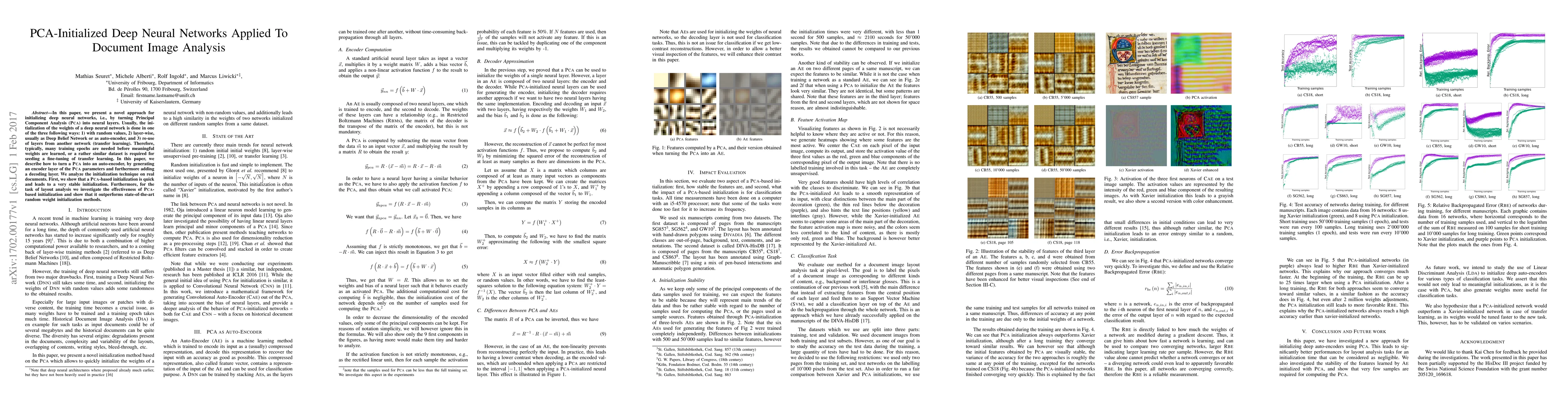 This paper introduces a PCA-initialized deep neural network approach for document image analysis, demonstrating that PCA-based initialization is faster and more stable than traditional methods. The study shows that this technique outperforms random weight initialization in layout analysis tasks.