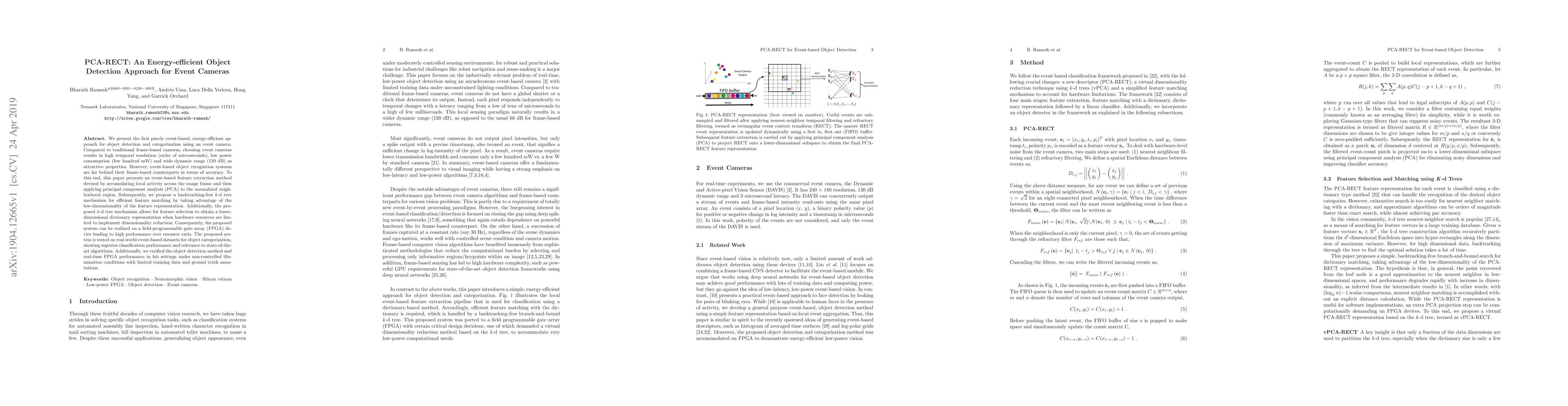 This paper introduces PCA-RECT, an energy-efficient object detection method for event cameras, leveraging high temporal resolution and low power consumption. It employs PCA for feature extraction and a k-d tree mechanism for efficient feature matching, demonstrating superior performance on real-world datasets.