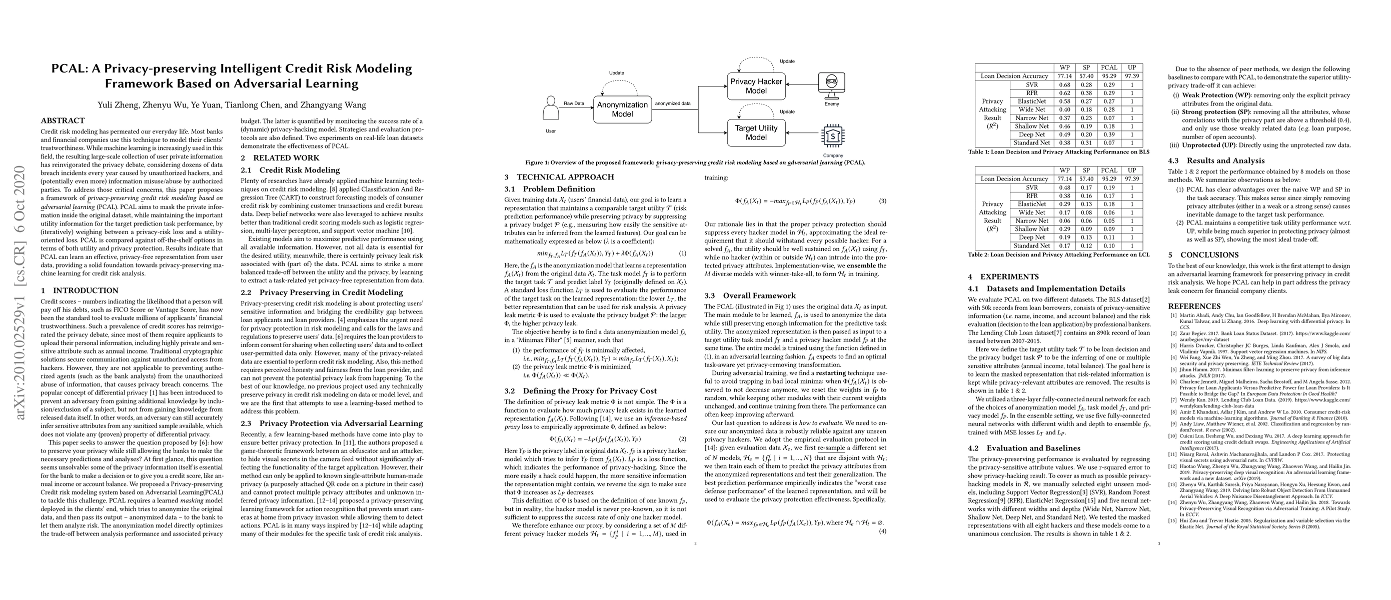 This paper introduces PCAL, a Privacy-preserving Intelligent Credit Risk Modeling Framework based on Adversarial Learning, designed to protect user privacy while maintaining predictive accuracy. PCAL balances privacy-risk and utility-oriented losses to ensure effective, privacy-free representation learning for credit risk analysis.