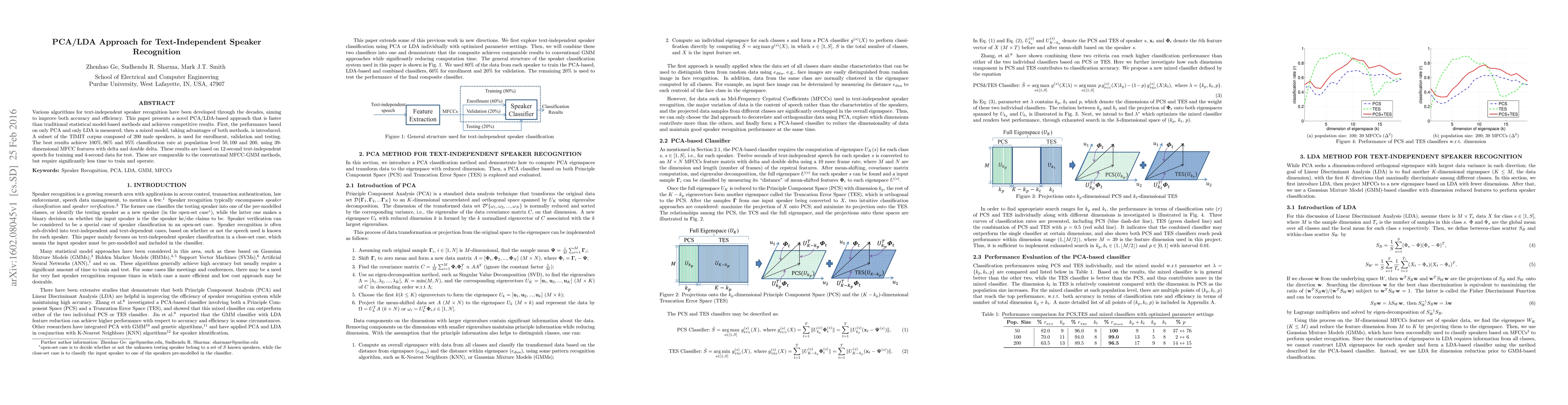This paper introduces a PCA/LDA-based approach for text-independent speaker recognition, achieving competitive results with faster training and operation compared to traditional methods. The study demonstrates 100%, 96%, and 95% classification rates using 39-dimensional MFCC features, outperforming conventional MFCC-GMM methods.