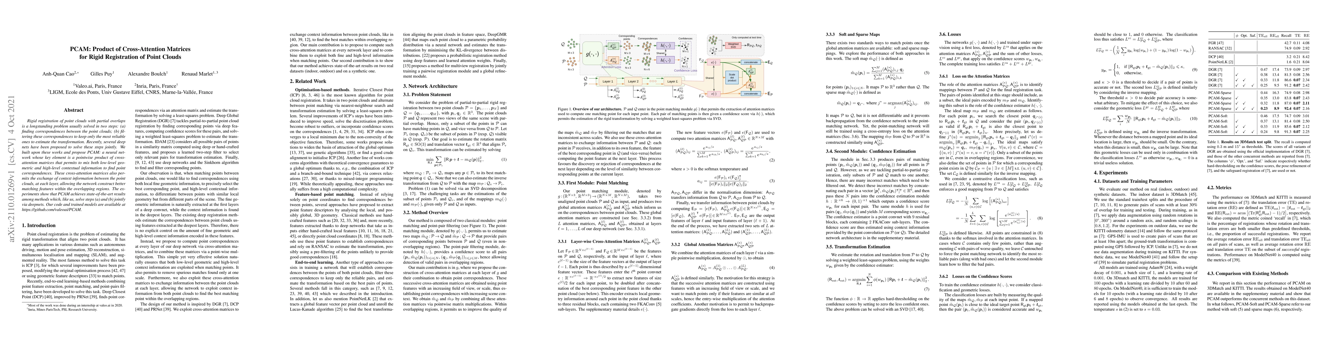 Rigid registration of point clouds with partial overlaps is a longstanding problem usually solved in two steps: (a) finding correspondences between the point clouds; (b) filtering these correspondences to keep only the most reliable ones to estimate the transformation. Recently, several deep nets have been proposed to solve these steps jointly. We built upon these works and propose PCAM: a neural network whose key element is a pointwise product of cross-attention matrices that permits to mix both low-level geometric and high-level contextual information to find point correspondences. These cross-attention matrices also permits the exchange of context information between the point clouds, at each layer, allowing the network construct better matching features within the overlapping regions. The experiments show that PCAM achieves state-of-the-art results among methods which, like us, solve steps (a) and (b) jointly via deepnets. Our code and trained models are available at https://github.com/valeoai/PCAM.