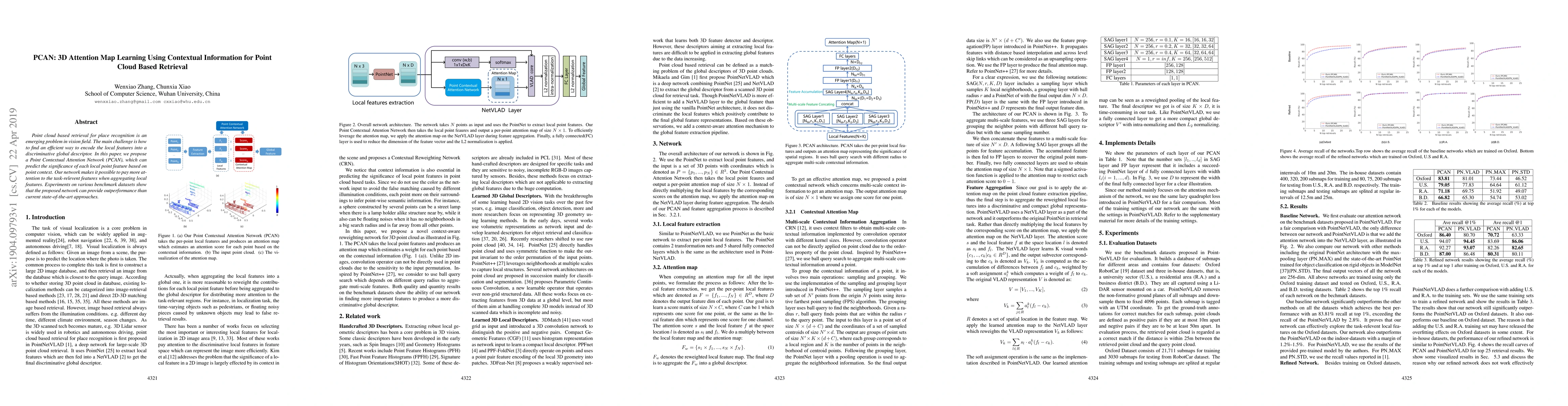 The paper proposes a Point Contextual Attention Network (PCAN) to enhance point cloud based retrieval by learning 3D attention maps using contextual information, leading to more efficient encoding of local features into a discriminative global descriptor. Experiments demonstrate PCAN outperforms current state-of-the-art methods on various benchmark datasets.