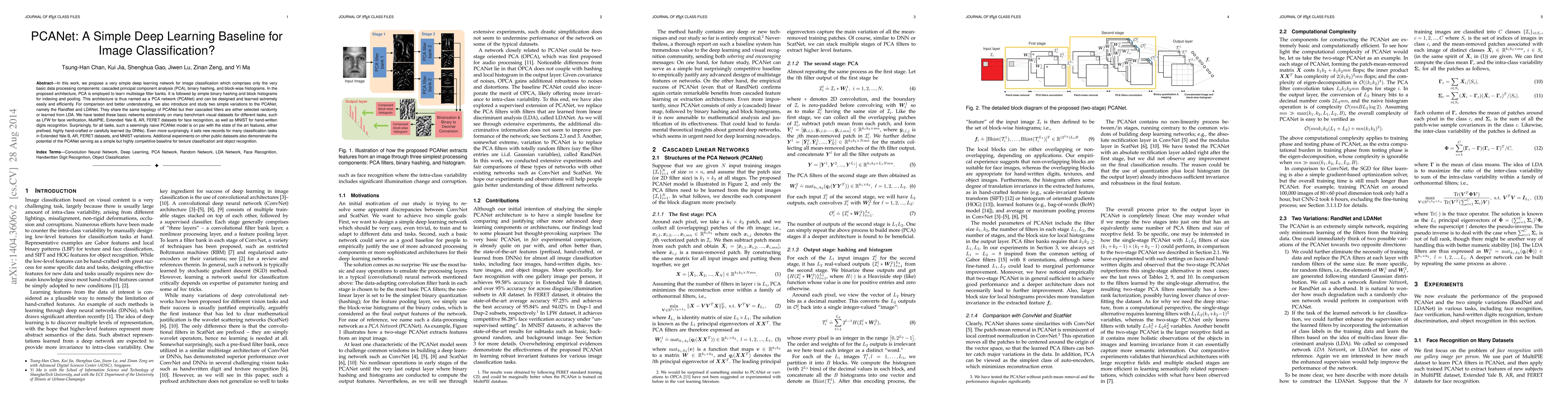 In this work, we propose a very simple deep learning network for image classification which comprises only the very basic data processing components: cascaded principal component analysis (PCA), binary hashing, and block-wise histograms. In the proposed architecture, PCA is employed to learn multistage filter banks. It is followed by simple binary hashing and block histograms for indexing and pooling. This architecture is thus named as a PCA network (PCANet) and can be designed and learned extremely easily and efficiently. For comparison and better understanding, we also introduce and study two simple variations to the PCANet, namely the RandNet and LDANet. They share the same topology of PCANet but their cascaded filters are either selected randomly or learned from LDA. We have tested these basic networks extensively on many benchmark visual datasets for different tasks, such as LFW for face verification, MultiPIE, Extended Yale B, AR, FERET datasets for face recognition, as well as MNIST for hand-written digits recognition. Surprisingly, for all tasks, such a seemingly naive PCANet model is on par with the state of the art features, either prefixed, highly hand-crafted or carefully learned (by DNNs). Even more surprisingly, it sets new records for many classification tasks in Extended Yale B, AR, FERET datasets, and MNIST variations. Additional experiments on other public datasets also demonstrate the potential of the PCANet serving as a simple but highly competitive baseline for texture classification and object recognition.