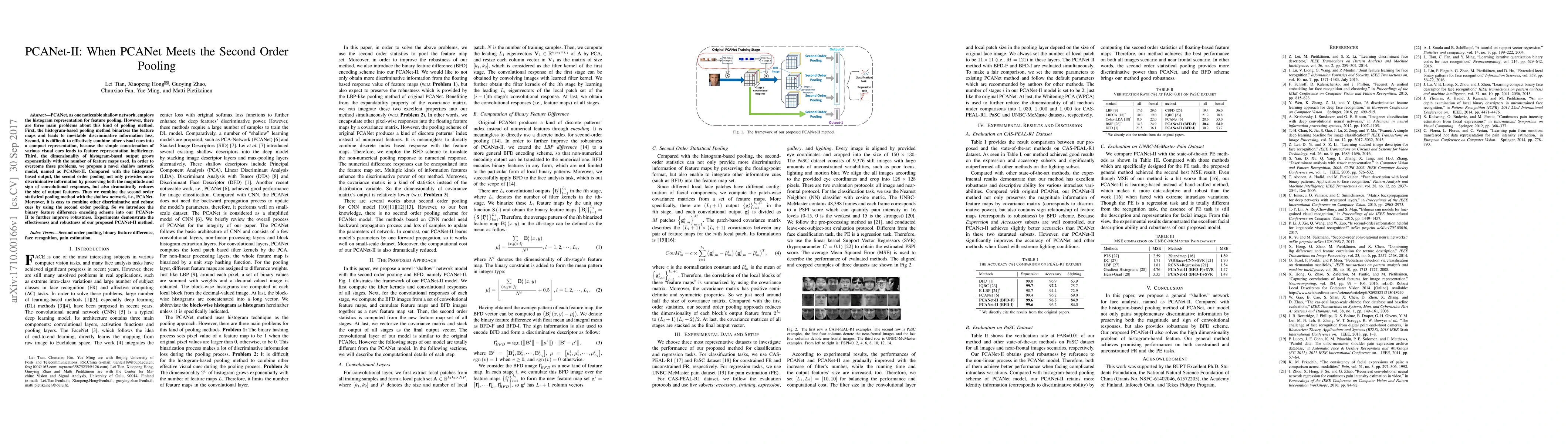 PCANet, as one noticeable shallow network, employs the histogram representation for feature pooling. However, there are three main problems about this kind of pooling method. First, the histogram-based pooling method binarizes the feature maps and leads to inevitable discriminative information loss. Second, it is difficult to effectively combine other visual cues into a compact representation, because the simple concatenation of various visual cues leads to feature representation inefficiency. Third, the dimensionality of histogram-based output grows exponentially with the number of feature maps used. In order to overcome these problems, we propose a novel shallow network model, named as PCANet-II. Compared with the histogram-based output, the second order pooling not only provides more discriminative information by preserving both the magnitude and sign of convolutional responses, but also dramatically reduces the size of output features. Thus we combine the second order statistical pooling method with the shallow network, i.e., PCANet. Moreover, it is easy to combine other discriminative and robust cues by using the second order pooling. So we introduce the binary feature difference encoding scheme into our PCANet-II to further improve robustness. Experiments demonstrate the effectiveness and robustness of our proposed PCANet-II method.