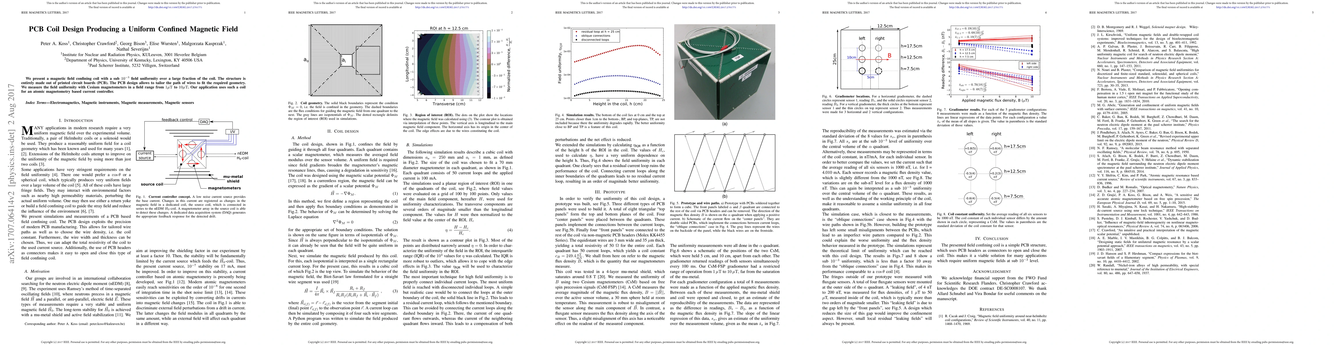 We present a magnetic field confining coil with a sub-$10^{-3}$ field uniformity over a large fraction of the coil. The structure is entirely made out of printed circuit boards (PCBs). The PCB design allows to tailor the path of wires to fit the required geometry. We measure the field uniformity with cesium magnetometers in a field range from 1 to 10 $\mu\mathrm{T}$. Our application uses such a coil for an atomic magnetometry-based current controller.
