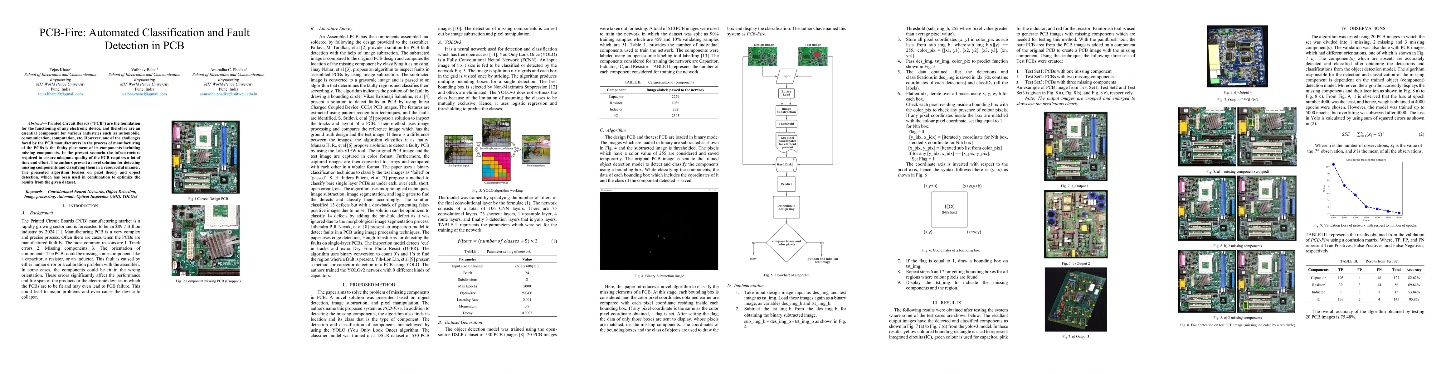 Title: PCB-Fire: Automated Classification and Fault Detection in PCB Summary: This paper introduces an automated algorithm for detecting and classifying faulty placements, including missing components in Printed Circuit Boards (PCBs) using pixel theory and object detection, aiming to streamline the quality assurance process in PCB manufacturing.