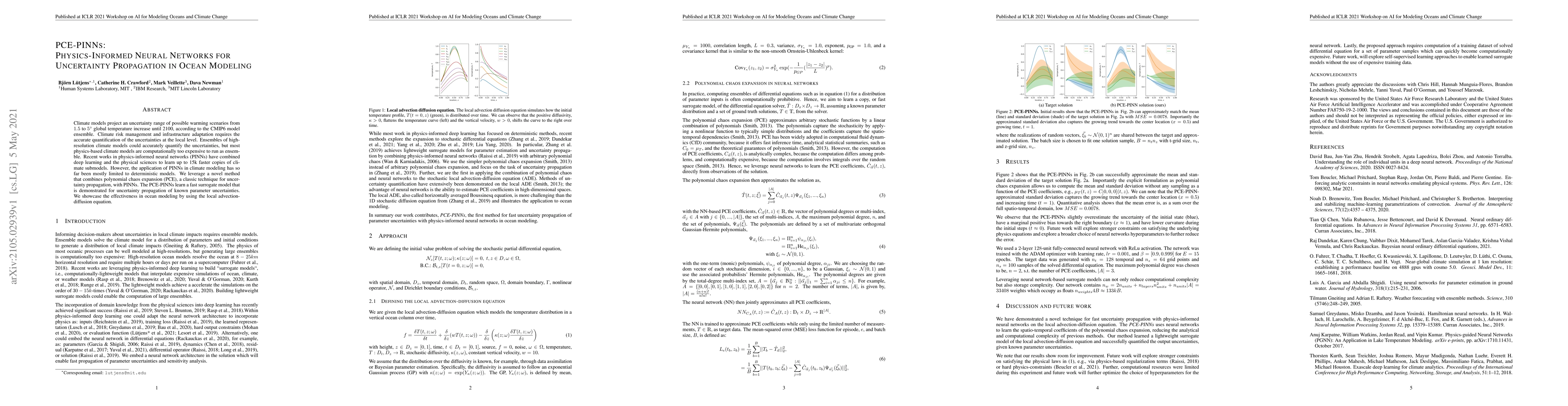 This paper introduces PCE-PINNs, a novel method combining polynomial chaos expansion with physics-informed neural networks for efficient uncertainty propagation in ocean modeling. The approach demonstrates significant speedups and accurate quantification of uncertainties in high-resolution climate models.