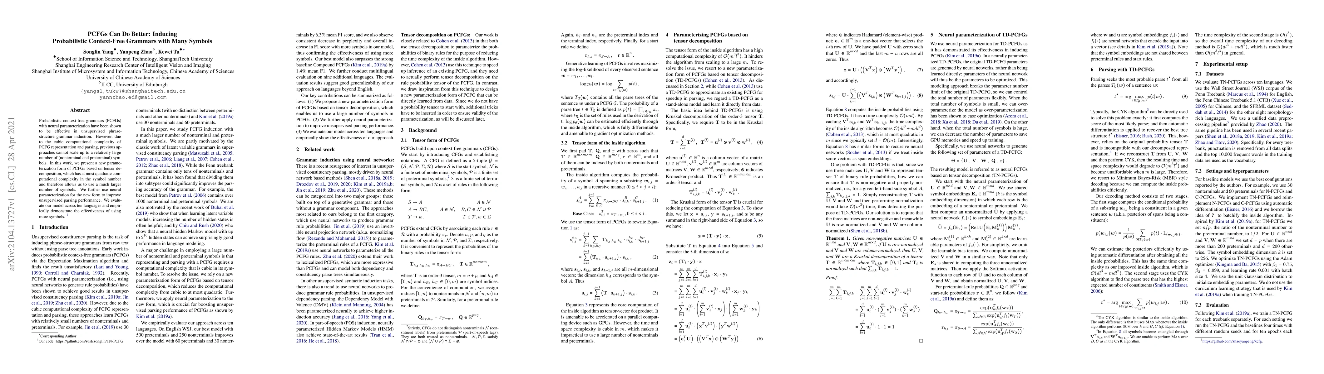This research introduces a new parameterization form of Probabilistic Context-Free Grammars (PCFGs) using tensor decomposition, reducing computational complexity from cubic to quadratic. This allows for a larger number of symbols, improving unsupervised parsing performance across ten languages.