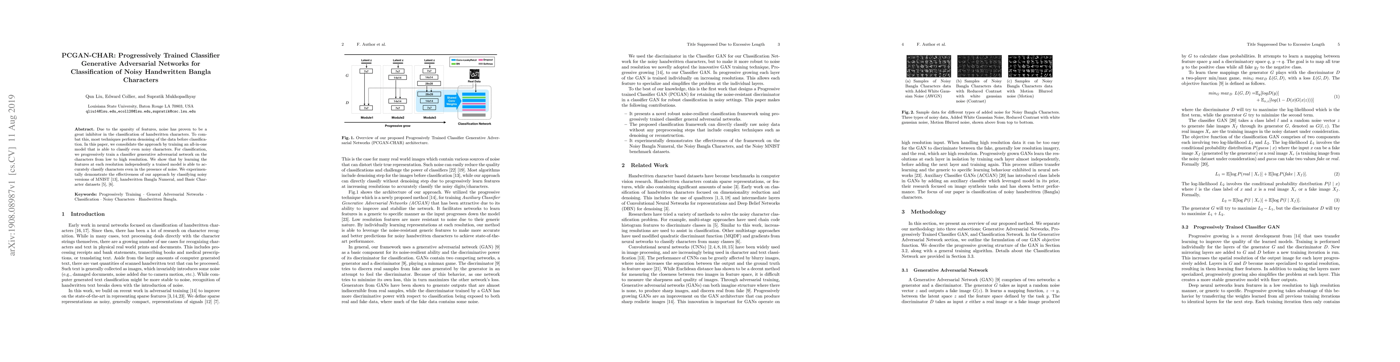 This paper proposes a progressively trained classifier generative adversarial network (PCGAN-CHAR) to classify noisy handwritten Bangla characters. By training the model at different resolutions, it effectively learns features independently, leading to accurate classification even in noisy conditions, as demonstrated on MNIST, Bangla Numeral, and Basic Character datasets.
