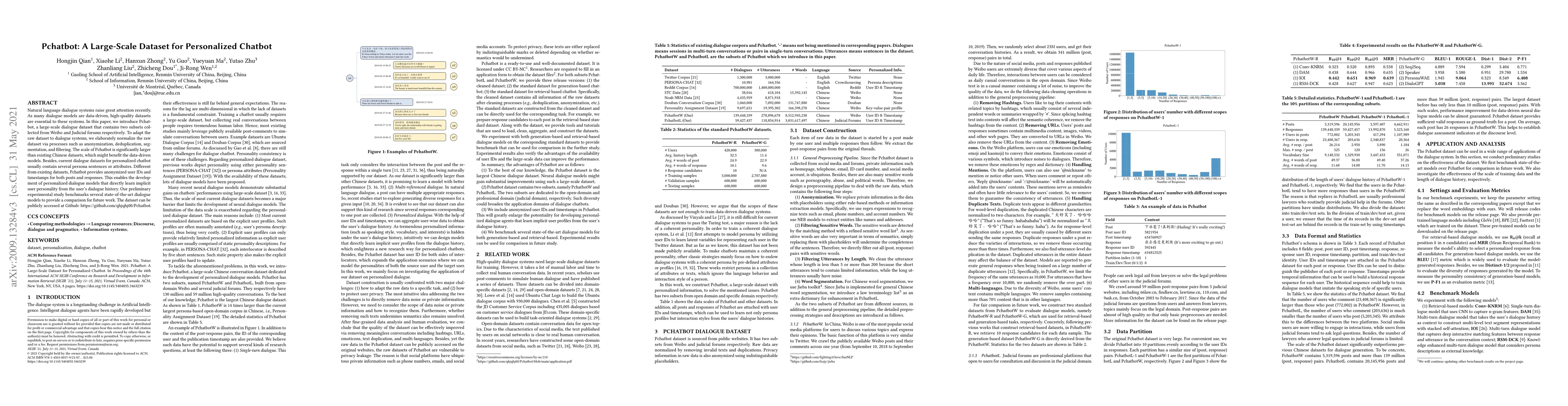 This paper introduces Pchatbot, a large-scale dialogue dataset for personalized chatbots, collected from Weibo and Judicial forums, with extensive normalization processes. It offers anonymized user IDs and timestamps for enhanced personalized dialogue models, surpassing existing Chinese datasets in scale.