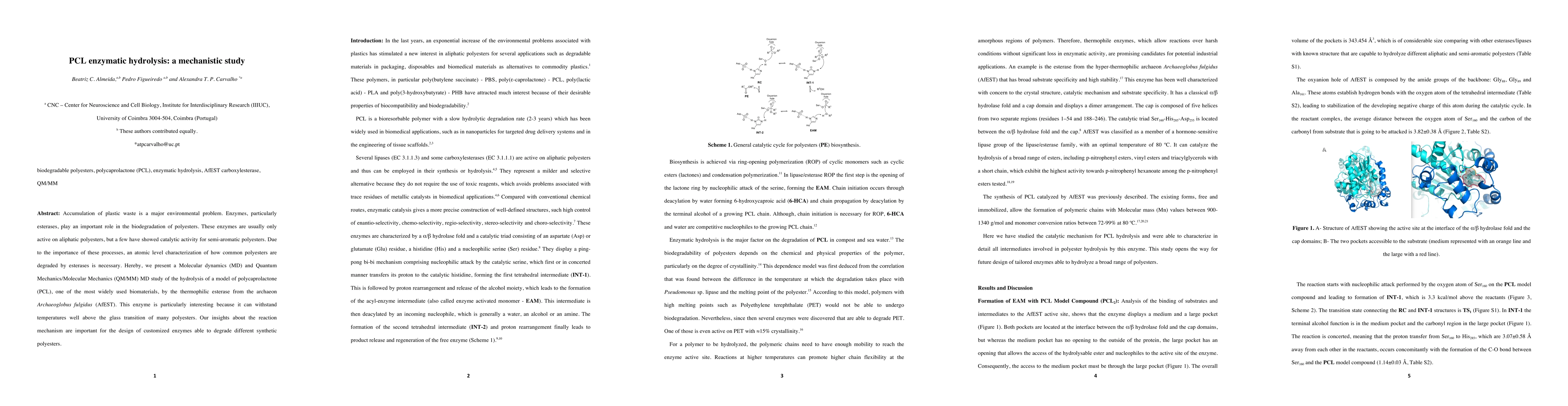 Accumulation of plastic waste is a major environmental problem. Enzymes, particularly esterases, play an important role in the biodegradation of polyesters. These enzymes are usually only active on aliphatic polyesters, but a few have showed catalytic activity for semi-aromatic polyesters. Due to the importance of these processes, an atomic level characterization of how common polyesters are degraded by esterases is necessary. Hereby, we present a Molecular dynamics (MD) and Quantum Mechanics/Molecular Mechanics (QM/MM) MD study of the hydrolysis of a model of polycaprolactone (PCL), one of the most widely used biomaterials, by the thermophilic esterase from the archaeon Archaeoglobus fulgidus (AfEST). This enzyme is particularly interesting because it can withstand temperatures well above the glass transition of many polyesters. Our insights about the reaction mechanism are important for the design of customized enzymes able to degrade different synthetic polyesters.