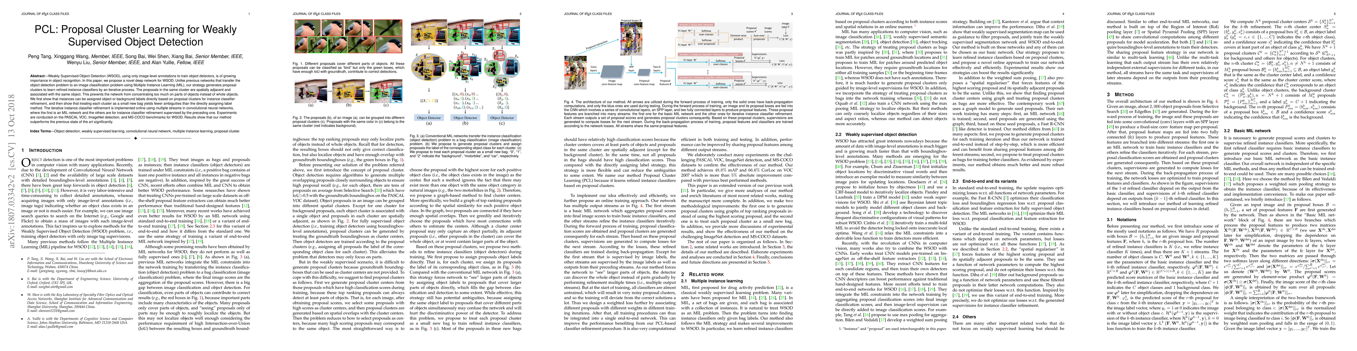 The paper introduces a novel deep network for Weakly Supervised Object Detection (WSOD) that generates proposal clusters for refined instance classifiers, iteratively refining these classifiers to avoid focusing on object parts rather than whole objects. The method outperforms previous state-of-the-art on benchmarks like PASCAL VOC, ImageNet detection, and MS-COCO.
