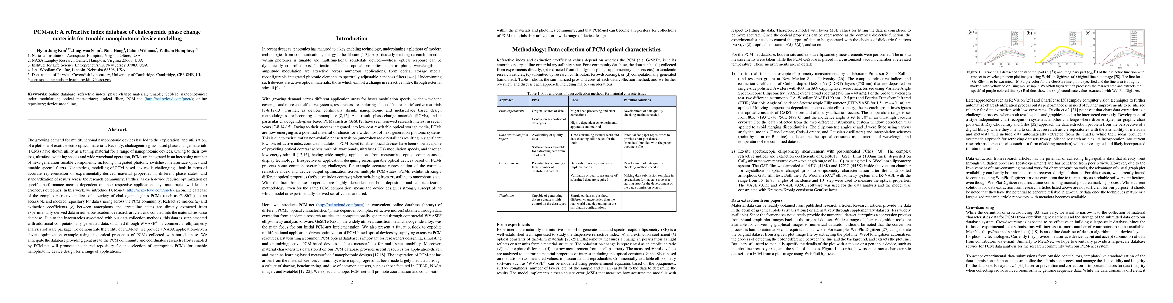 PCMnet is a newly introduced online database compiling complex refractive indices of chalcogenide glass phase change materials (PCMs) for nanophotonic device modelling. The database aims to standardize and share experimentally-derived and computationally-generated data to facilitate the design of tunable nanophotonic components.