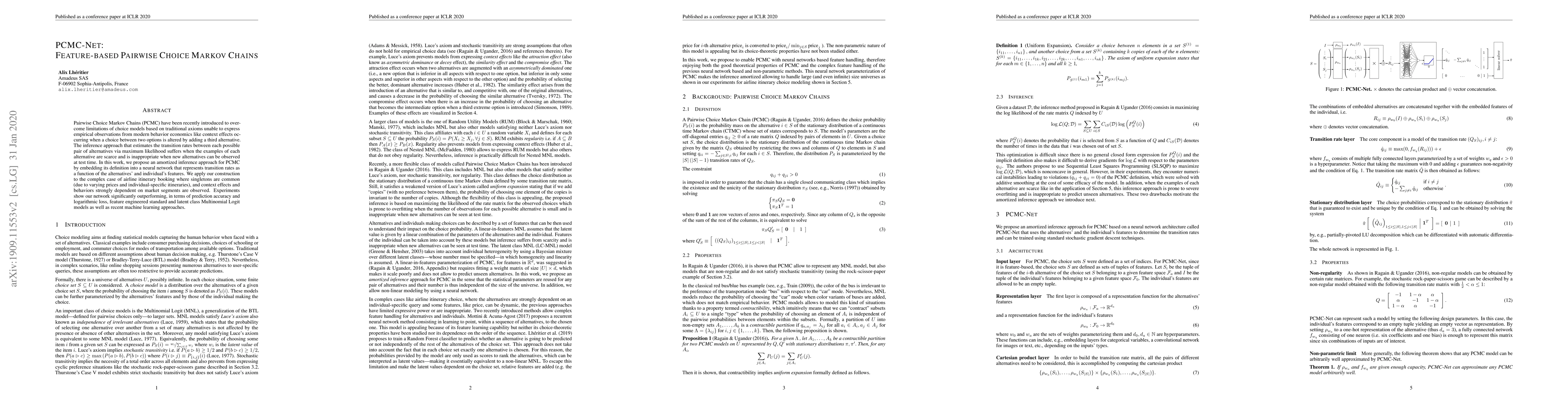 PCMC-Net introduces an amortized inference approach for Pairwise Choice Markov Chains by embedding transition rates into a neural network based on features, significantly improving prediction accuracy in airline itinerary booking scenarios. The method outperforms traditional and modern machine learning models in terms of both prediction accuracy and logarithmic loss.
