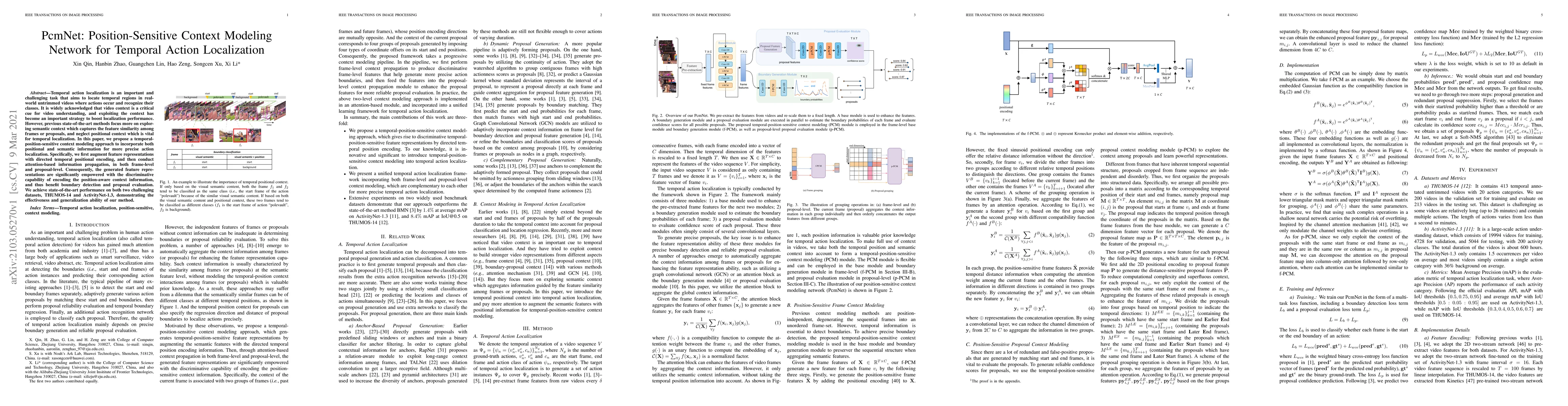PcmNet introduces a position-sensitive context modeling network to enhance temporal action localization by incorporating both positional and semantic context. The method achieves state-of-the-art performance on THUMOS-14 and ActivityNet-1.3 by leveraging directed temporal positional encoding and attention-based information propagation.