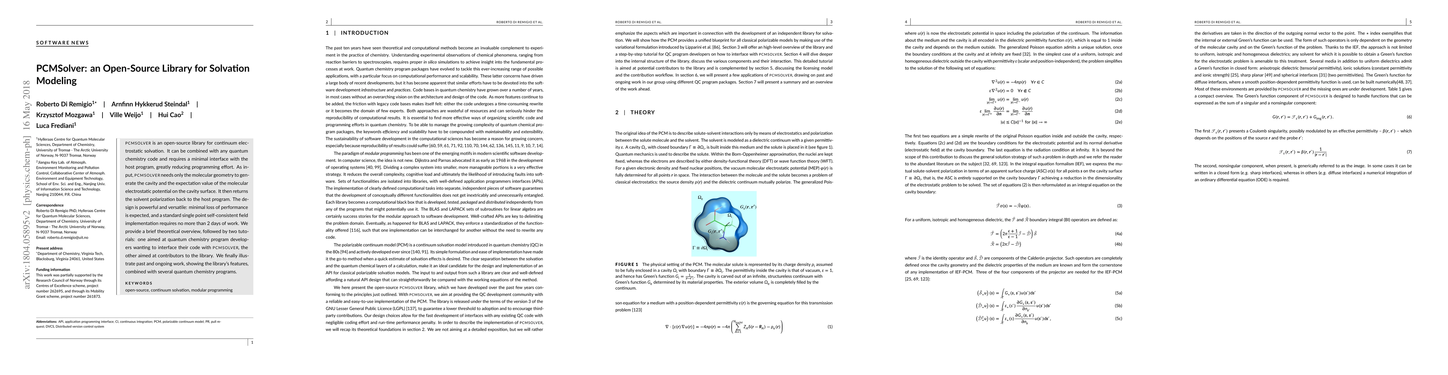PCMSolver is an open-source library for continuum electrostatic solvation, designed to integrate seamlessly with quantum chemistry codes with minimal programming effort. It requires molecular geometry and electrostatic potential for cavity generation and returns solvent polarization, demonstrating minimal performance loss and ease of implementation.
