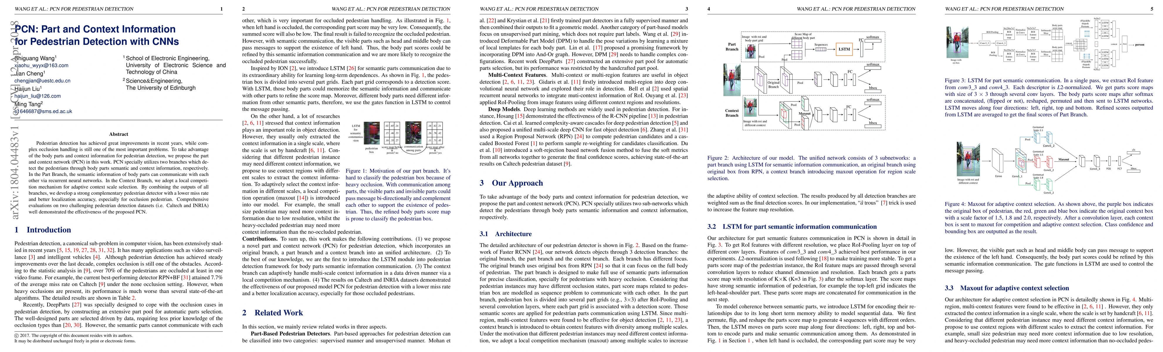 A new pedestrian detection system called PCN combines body part information with context to improve accuracy, especially for occluded pedestrians, outperforming existing methods on challenging datasets.