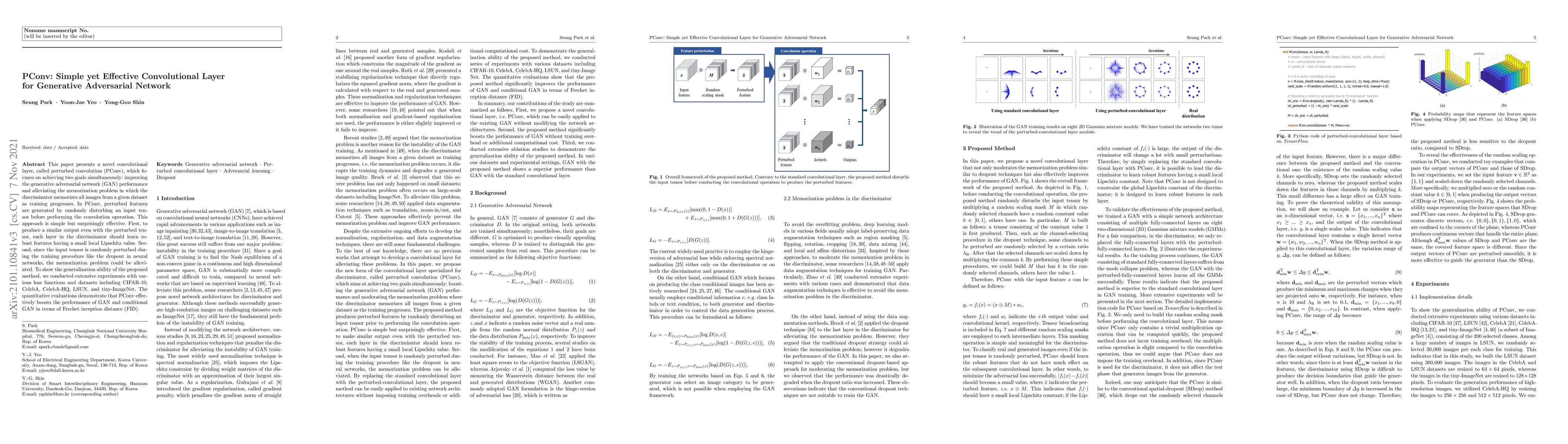 This paper presents a novel convolutional layer, called perturbed convolution (PConv), which focuses on achieving two goals simultaneously: improving the generative adversarial network (GAN) performance and alleviating the memorization problem in which the discriminator memorizes all images from a given dataset as training progresses. In PConv, perturbed features are generated by randomly disturbing an input tensor before performing the convolution operation. This approach is simple but surprisingly effective. First, to produce a similar output even with the perturbed tensor, each layer in the discriminator should learn robust features having a small local Lipschitz value. Second, since the input tensor is randomly perturbed during the training procedure like the dropout in neural networks, the memorization problem could be alleviated. To show the generalization ability of the proposed method, we conducted extensive experiments with various loss functions and datasets including CIFAR-10, CelebA, CelebA-HQ, LSUN, and tiny-ImageNet. The quantitative evaluations demonstrate that PConv effectively boosts the performance of GAN and conditional GAN in terms of Frechet inception distance (FID).