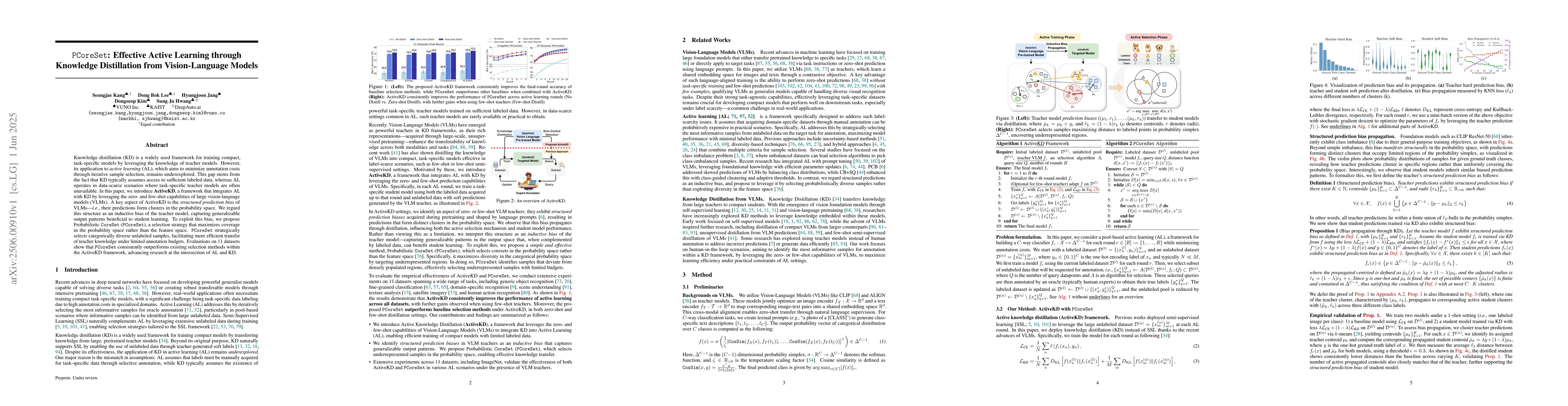 The paper introduces ActiveKD, a framework that integrates active learning (AL) with knowledge distillation (KD) by leveraging the zero- and few-shot capabilities of large vision-language models (VLMs). A key aspect is the Probabilistic CoreSet (PCoreSet) selection strategy, which maximizes coverage in the probability space rather than the feature space, selecting categorically diverse unlabeled samples for efficient transfer of teacher knowledge under limited annotation budgets.