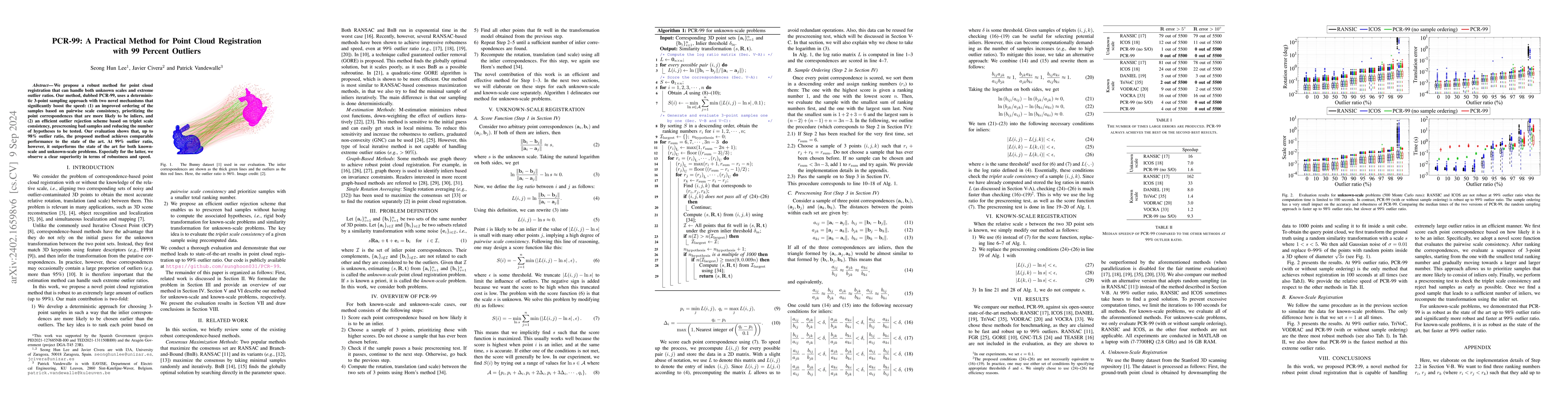 The PCR-99 method presents a robust point cloud registration technique capable of handling extreme outlier ratios up to 99%. It employs a deterministic 3-point sampling approach with mechanisms to improve speed and prioritize inliers, significantly outperforming state-of-the-art methods in the presence of high outlier ratios, especially for unknown-scale problems.