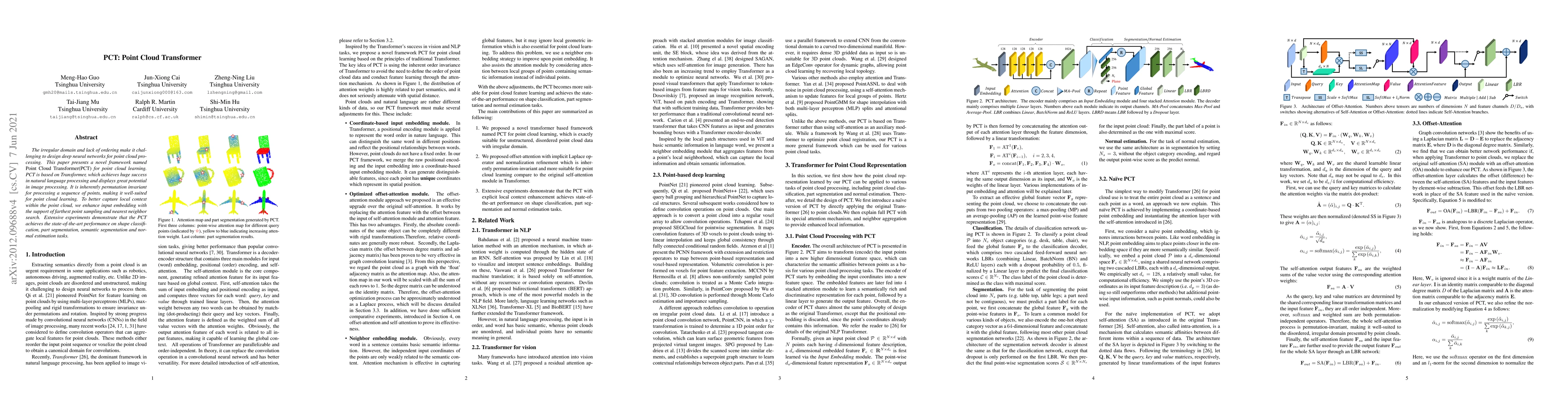 The irregular domain and lack of ordering make it challenging to design deep neural networks for point cloud processing. This paper presents a novel framework named Point Cloud Transformer(PCT) for point cloud learning. PCT is based on Transformer, which achieves huge success in natural language processing and displays great potential in image processing. It is inherently permutation invariant for processing a sequence of points, making it well-suited for point cloud learning. To better capture local context within the point cloud, we enhance input embedding with the support of farthest point sampling and nearest neighbor search. Extensive experiments demonstrate that the PCT achieves the state-of-the-art performance on shape classification, part segmentation and normal estimation tasks.