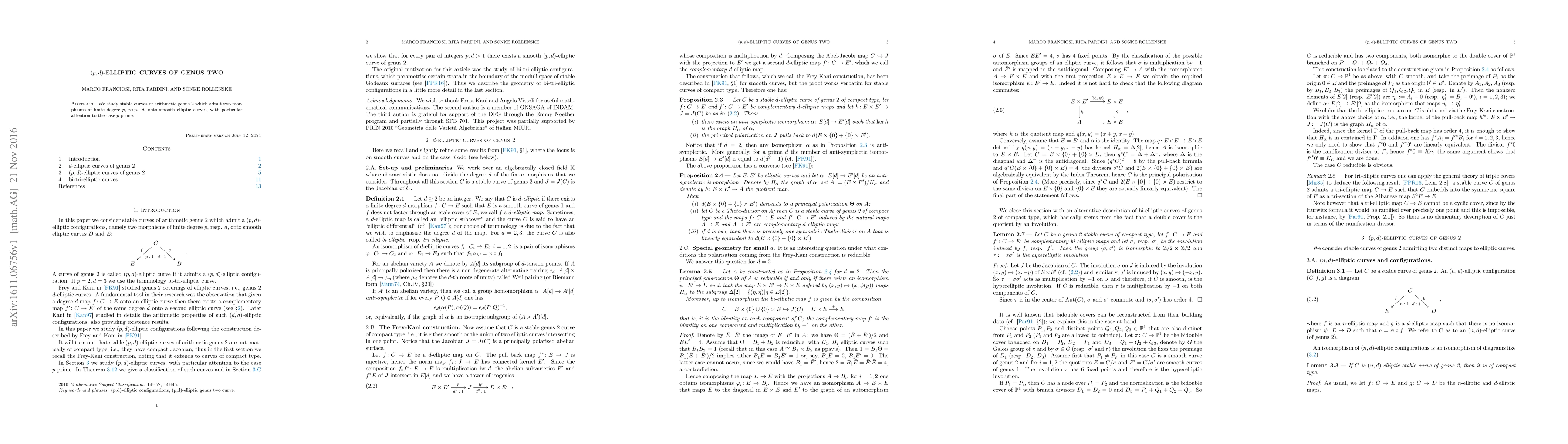 The paper studies stable curves of arithmetic genus 2 admitting two morphisms of finite degree p and d, respectively, onto smooth elliptic curves, with a focus on the prime case for p.