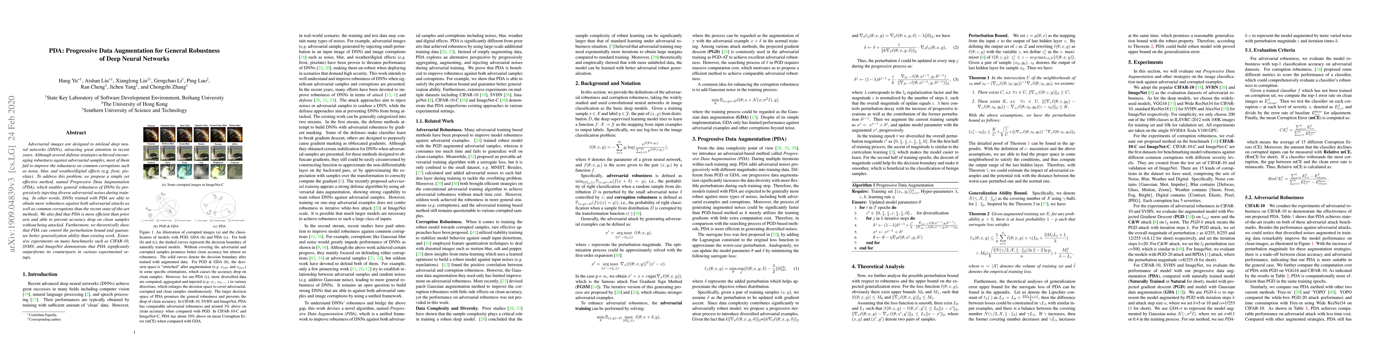 A new method called Progressive Data Augmentation (PDA) improves deep neural networks' robustness against adversarial attacks and common corruptions like noise and weather effects. PDA enhances the networks' ability to generalize well without compromising clean sample accuracy.