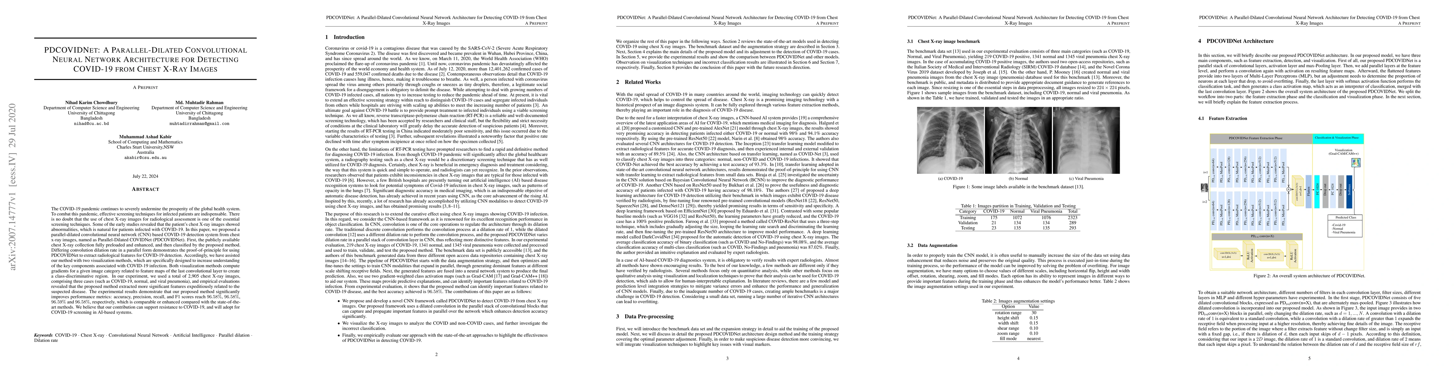 This paper introduces PDCOVIDNet, a parallel-dilated convolutional neural network designed to detect COVID-19 from chest X-ray images. The method employs a collection of preloaded and enhanced chest X-ray images, achieving high accuracy, precision, recall, and F1 scores, demonstrating its effectiveness in radiological assessment during the pandemic. For further details, refer to the original research publication.