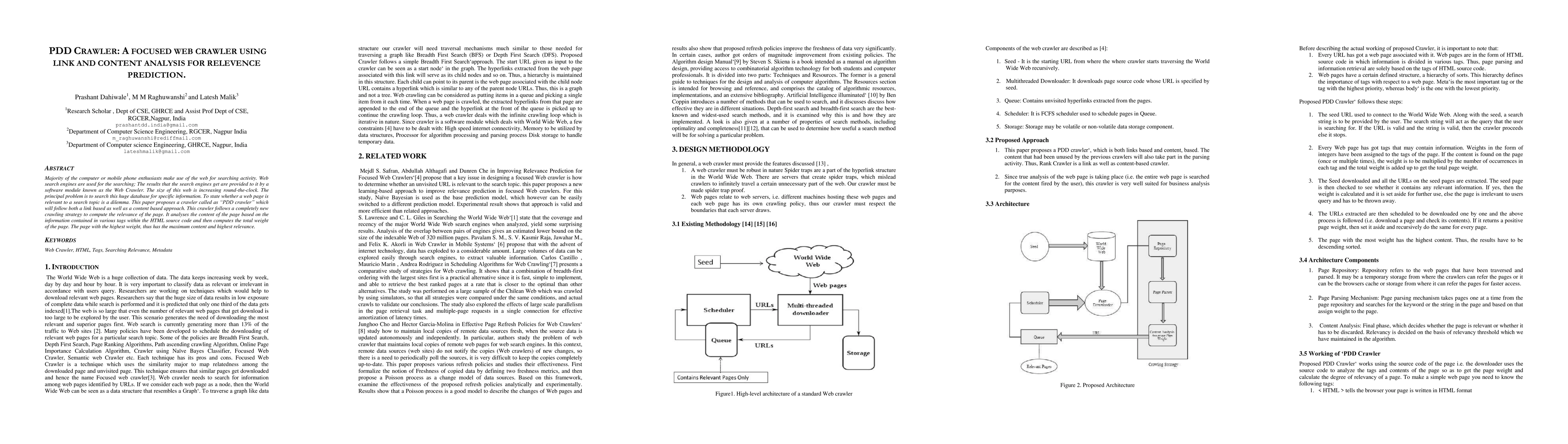The PDD crawler employs a dual strategy combining link and content analysis to predict web page relevance, aiming to efficiently navigate the ever-growing web and determine the most pertinent pages for specific search queries. This innovative crawler evaluates page content through HTML tags to assign a relevance weight, identifying the most relevant pages based on this computed score.