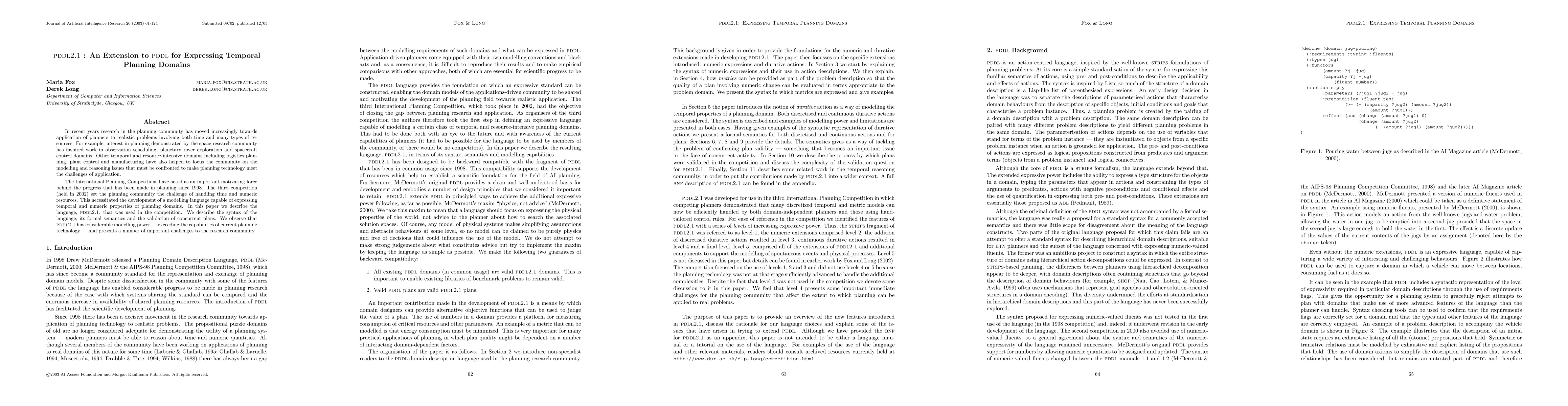 In recent years research in the planning community has moved increasingly toward s application of planners to realistic problems involving both time and many typ es of resources. For example, interest in planning demonstrated by the space res earch community has inspired work in observation scheduling, planetary rover ex ploration and spacecraft control domains. Other temporal and resource-intensive domains including logistics planning, plant control and manufacturing have also helped to focus the community on the modelling and reasoning issues that must be confronted to make planning technology meet the challenges of application. The International Planning Competitions have acted as an important motivating fo rce behind the progress that has been made in planning since 1998. The third com petition (held in 2002) set the planning community the challenge of handling tim e and numeric resources. This necessitated the development of a modelling langua ge capable of expressing temporal and numeric properties of planning domains. In this paper we describe the language, PDDL2.1, that was used in the competition. We describe the syntax of the language, its formal semantics and the validation of concurrent plans. We observe that PDDL2.1 has considerable modelling power --- exceeding the capabilities of current planning technology --- and presents a number of important challenges to the research community.